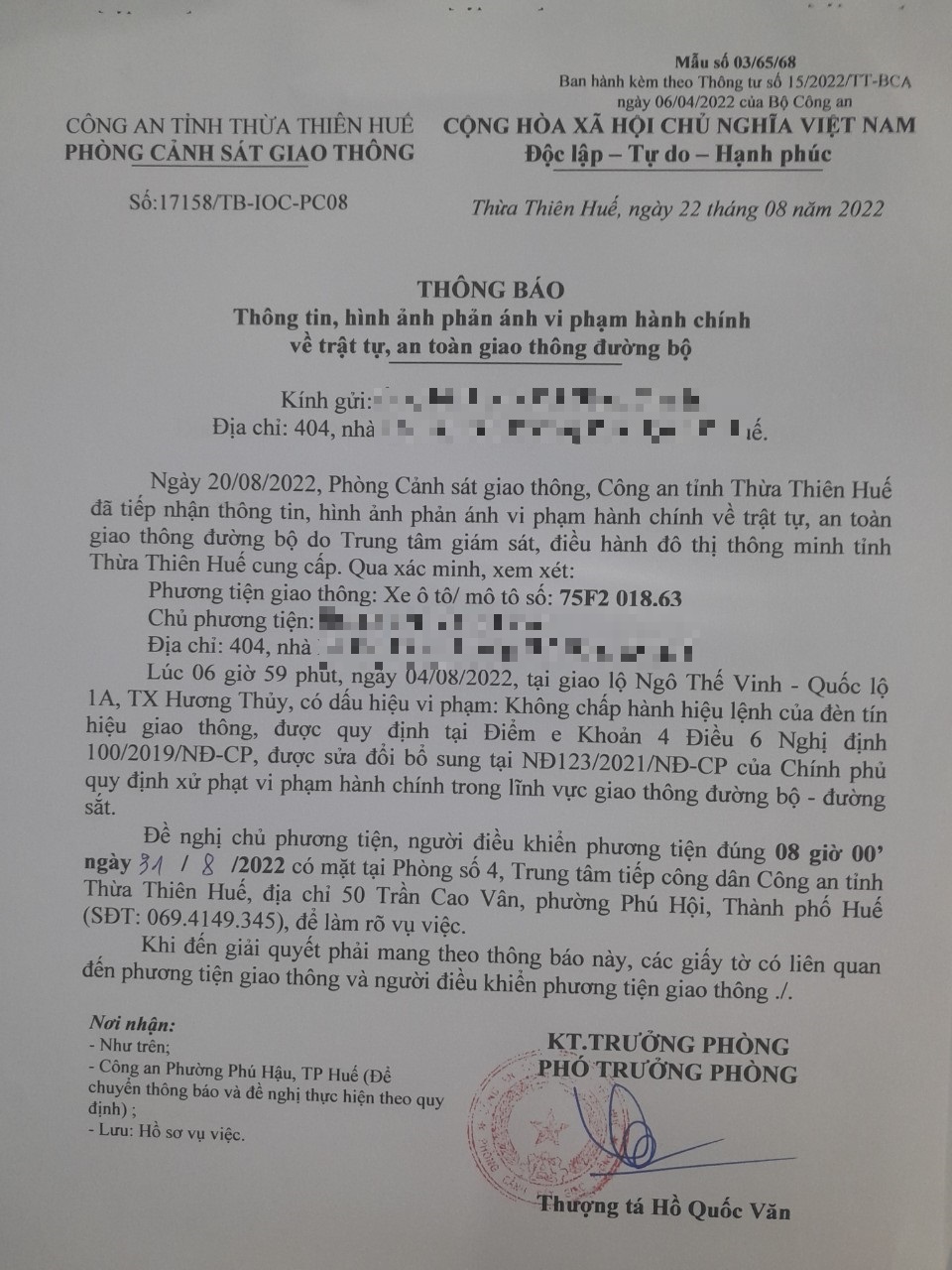 Vào lúc 06 giờ 59 phút, ngày 04/08/2022 Xe máy mang biển kiểm soát 75F201863 Không chấp hành hiệu lệnh của đèn tín hiệu giao thông tại địa điểm Ngô Thế Vinh - QL1A