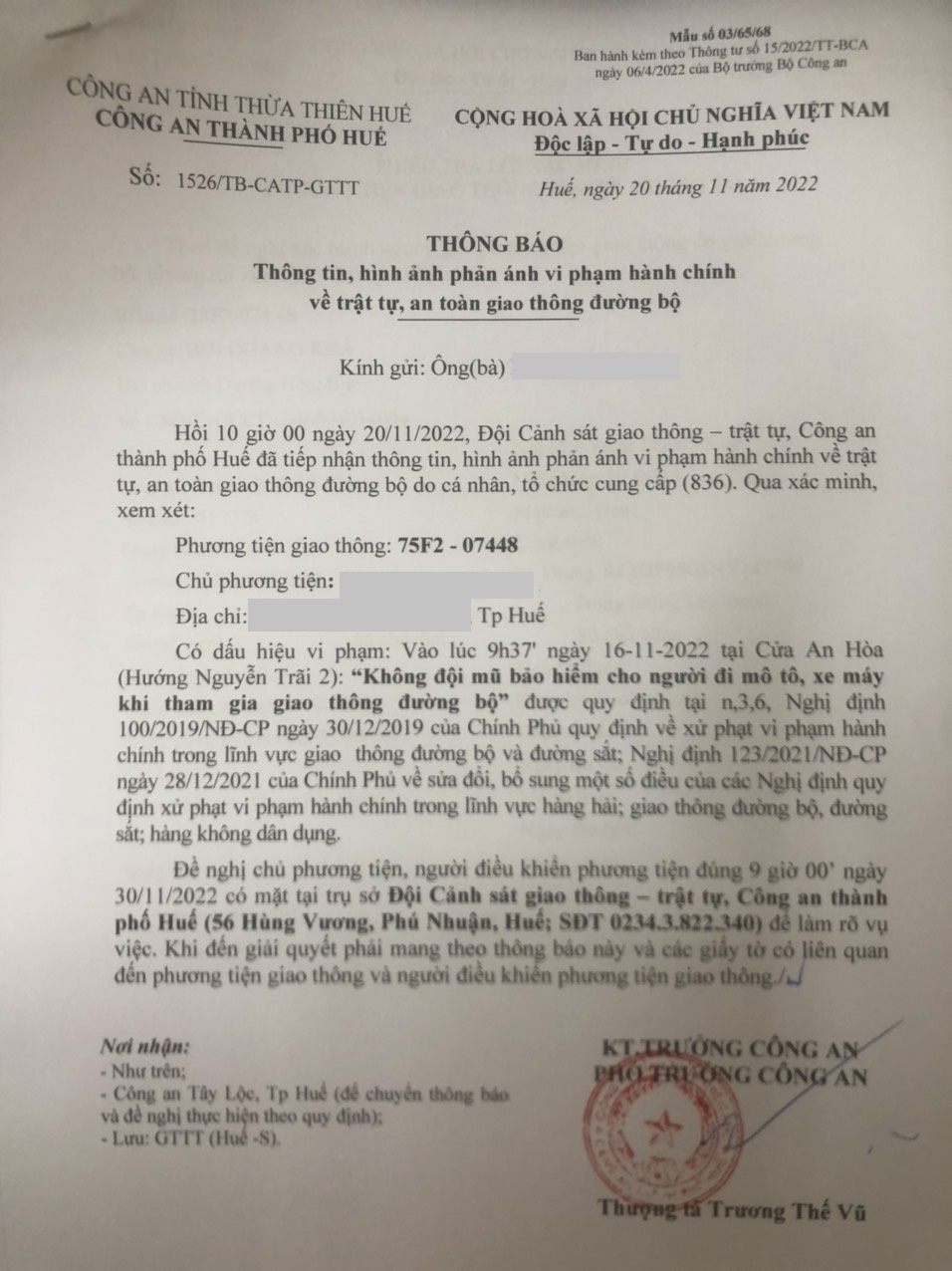 Vấn đề quý Ông/Bà phản ánh, Công an tỉnh đã chỉ đạo Công an thành phố Huế kiểm tra và xin thông báo kết quả xử lý như sau: