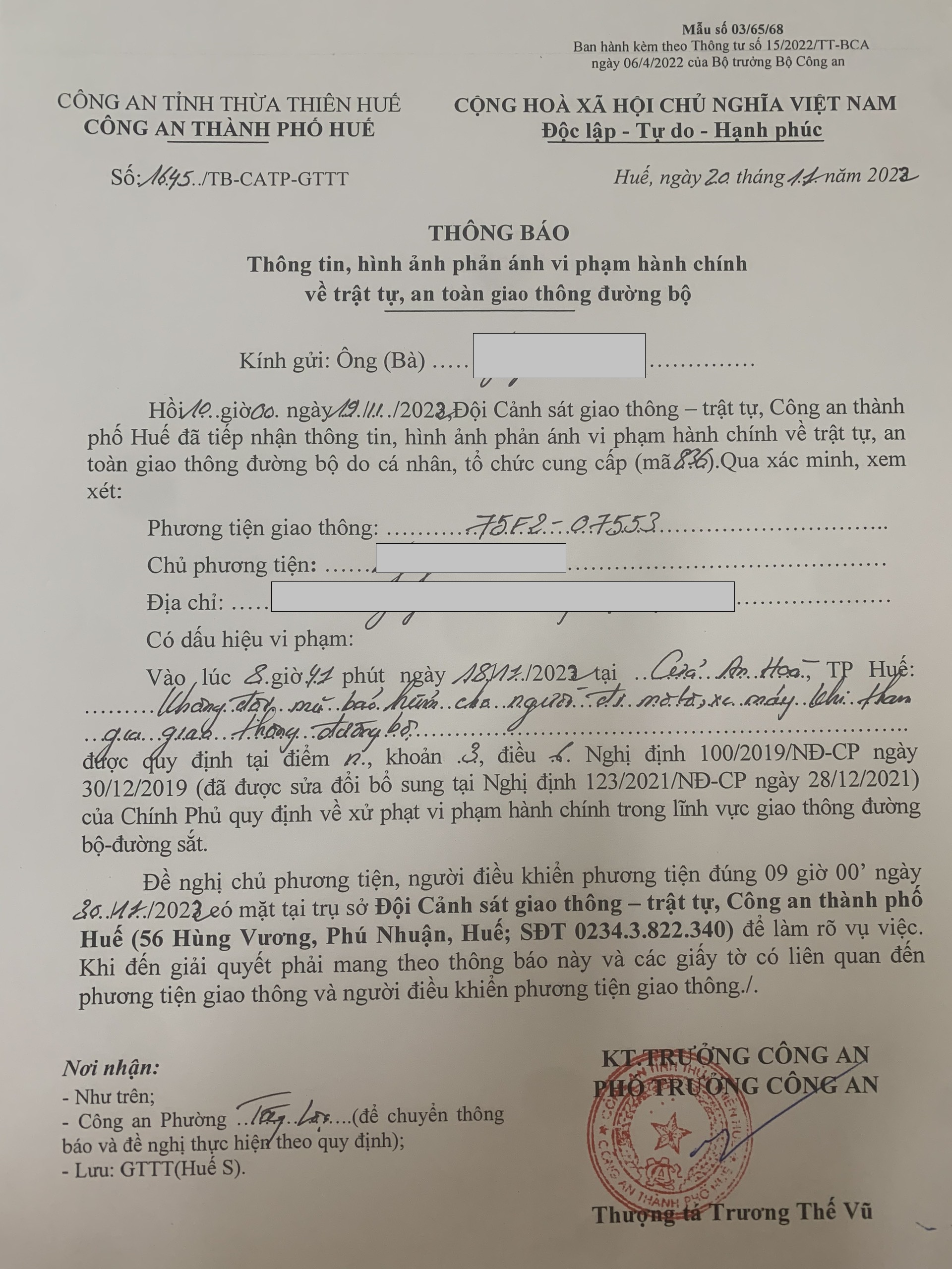 Vấn đề quý Ông/Bà phản ánh, Công an tỉnh đã chỉ đạo Công an thành phố Huế kiểm tra và xin thông báo kết quả xử lý như sau: