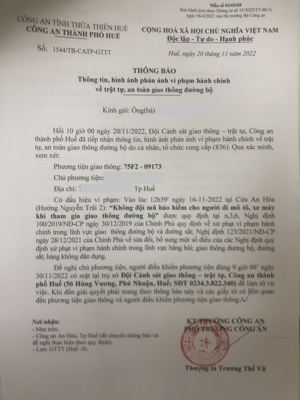 Vấn đề Ông/Bà phản ánh, Công an tỉnh đã chỉ đạo Công an thành phố Huế kiểm tra và xin thông báo kết quả xử lý như sau: