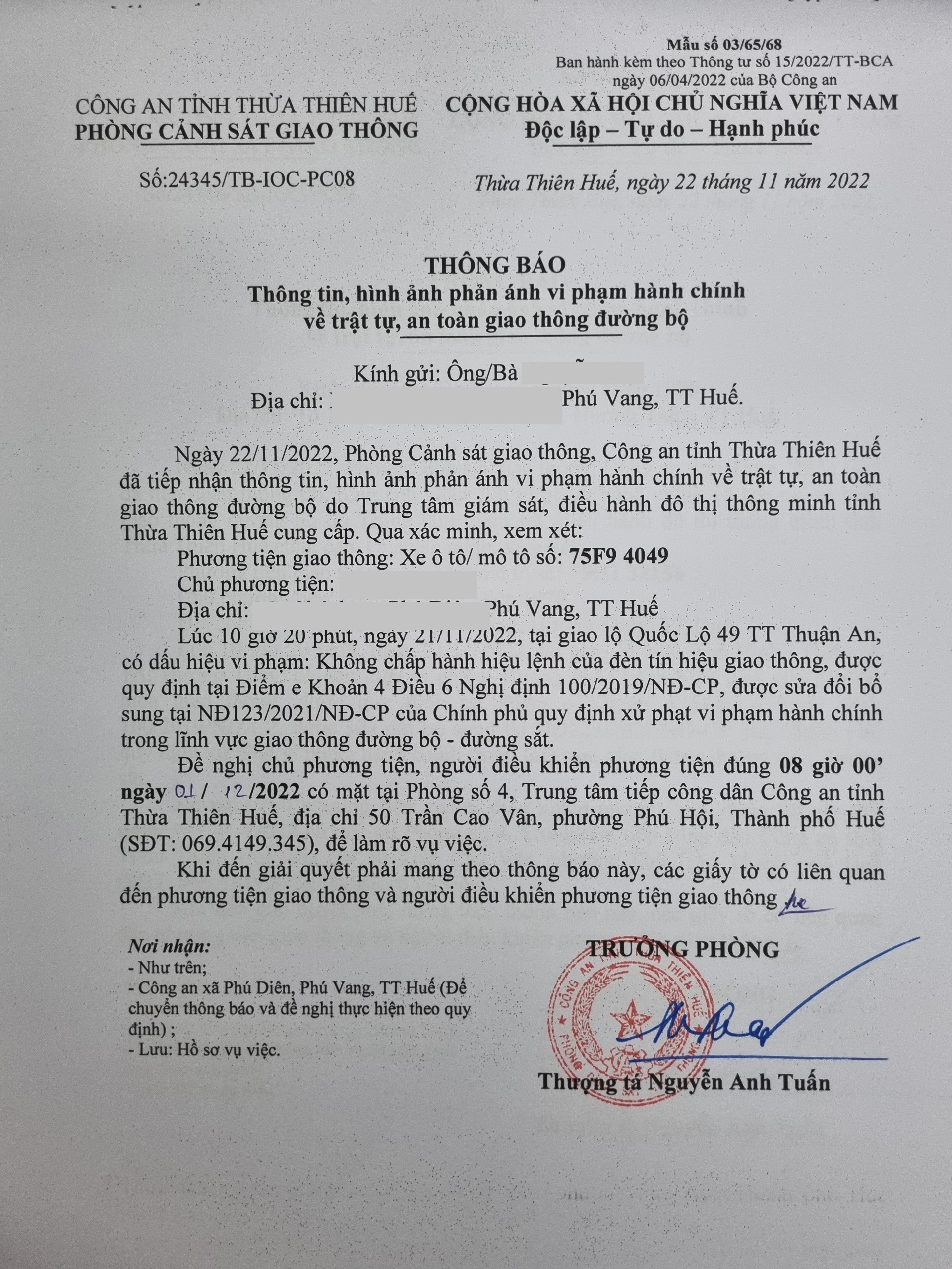 Phòng Cảnh sát giao thông xác định lỗi vi phạm của người điều khiển phương tiện 75F94049: Không chấp hành hiệu lệnh đèn tín hiệu giao thông, quy định tại điểm e, khoản 4, điều 6 Nghị định 100/2019/NĐ-CP được sửa đổi, bổ sung tại NĐ 123/2021/NĐ-CP.