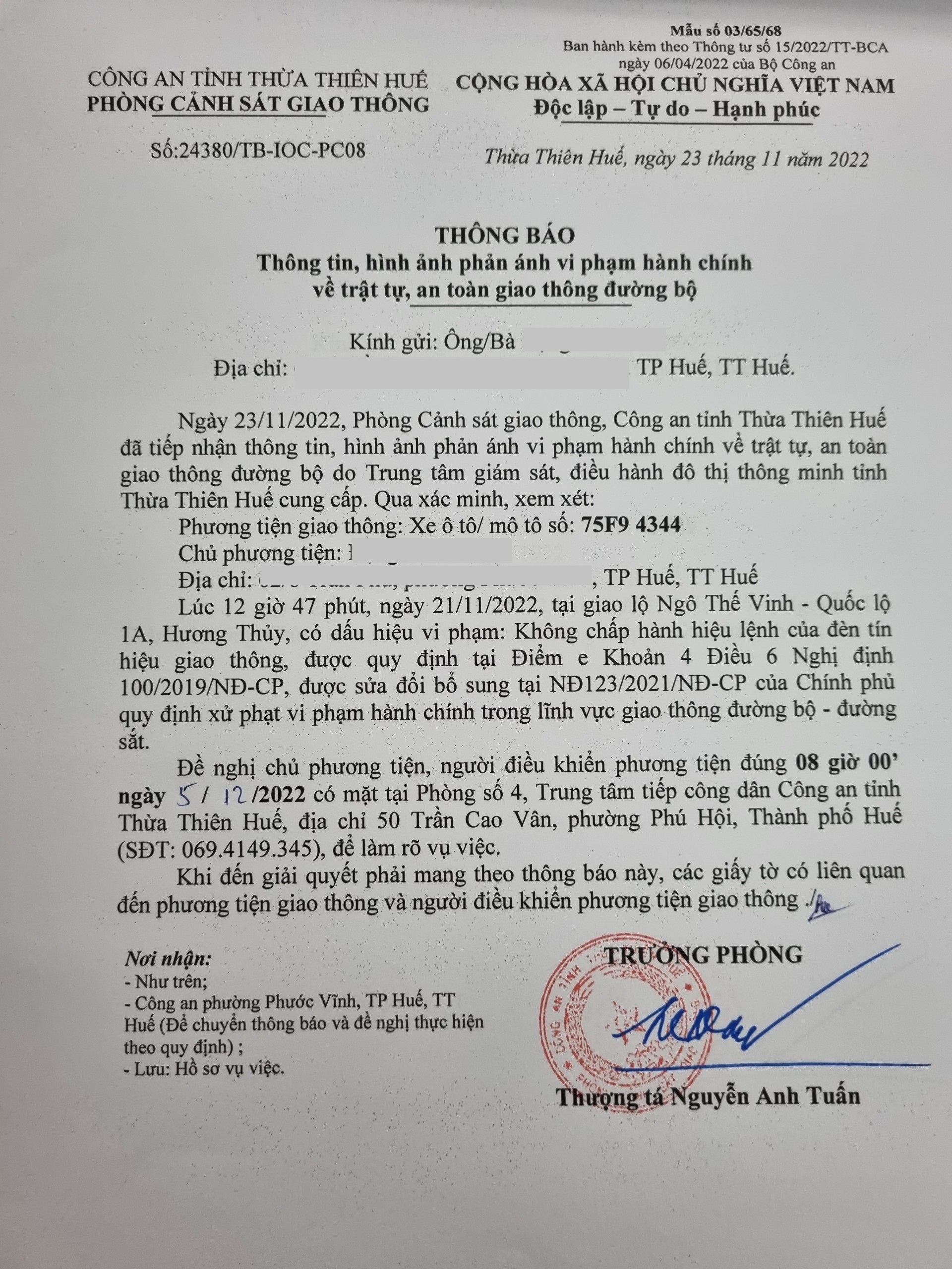 Phòng Cảnh sát giao thông xác định lỗi vi phạm của người điều khiển phương tiện 75F94344: Không chấp hành hiệu lệnh đèn tín hiệu giao thông, quy định tại điểm e, khoản 4, điều 6 Nghị định 100/2019/NĐ-CP được sửa đổi, bổ sung tại NĐ 123/2021/NĐ-CP.
