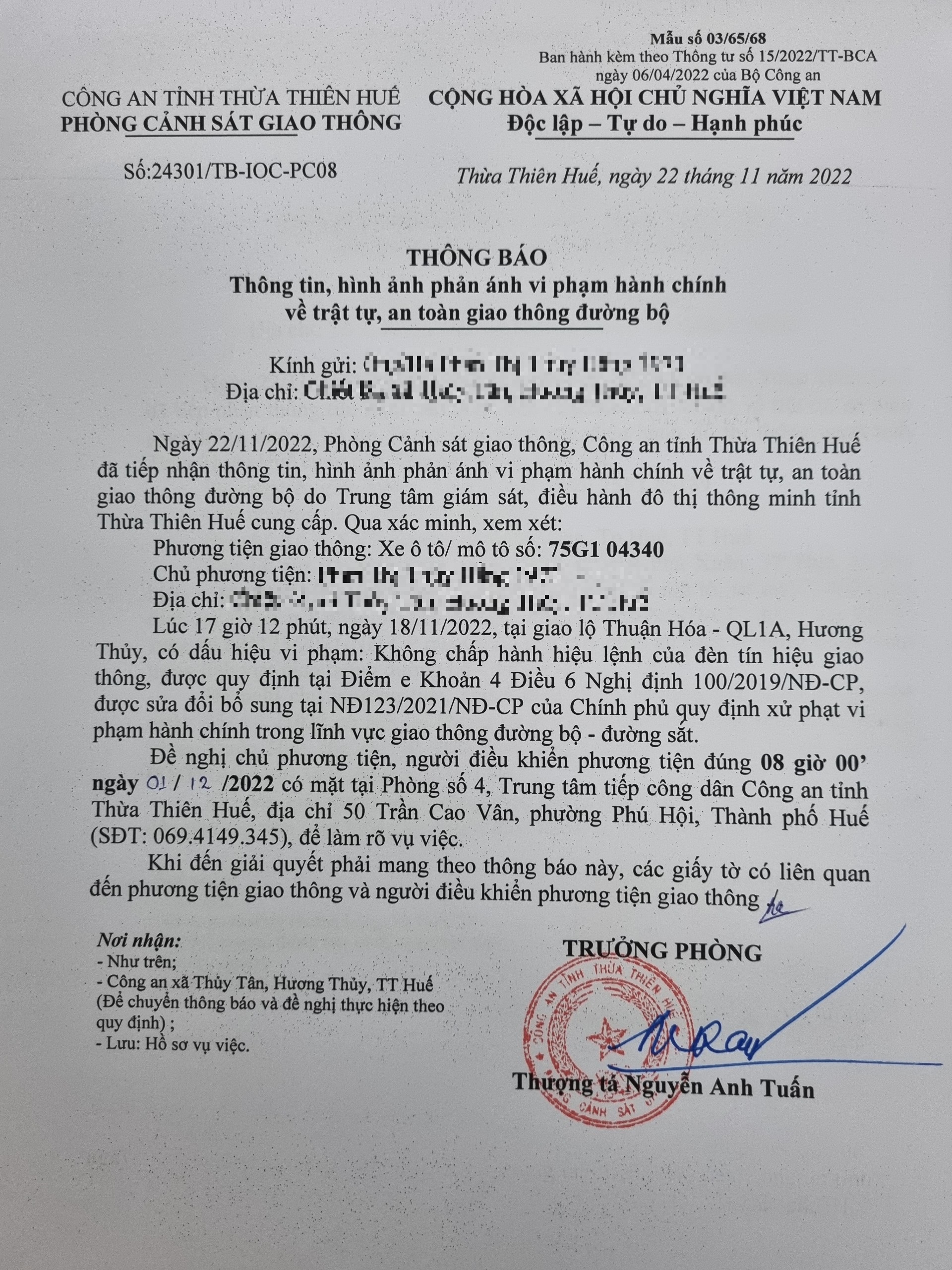 Phòng Cảnh sát giao thông xác định lỗi vi phạm của người điều khiển phương tiện 75G104340: Không chấp hành hiệu lệnh đèn tín hiệu giao thông, quy định tại điểm e, khoản 4, điều 6 Nghị định 100/2019/NĐ-CP được sửa đổi, bổ sung tại NĐ 123/2021/NĐ-CP.