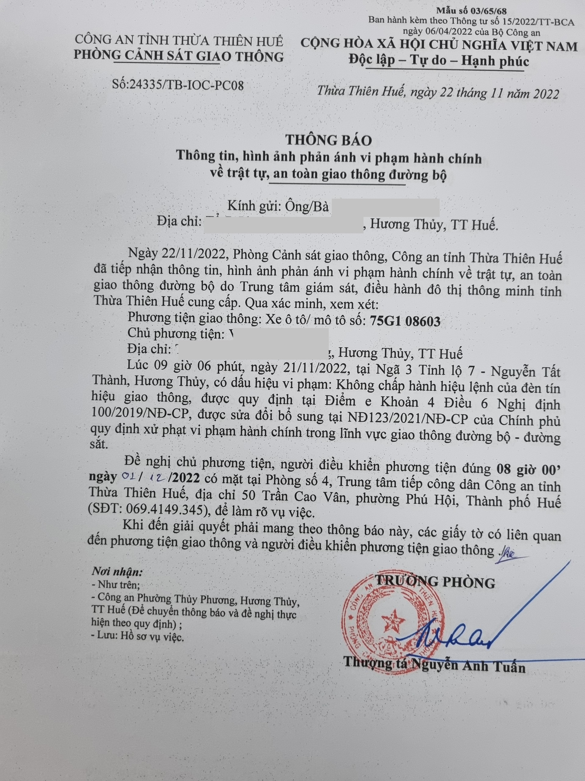 Phòng Cảnh sát giao thông xác định lỗi vi phạm của người điều khiển phương tiện 75G108603: Không chấp hành hiệu lệnh đèn tín hiệu giao thông, quy định tại điểm e, khoản 4, điều 6 Nghị định 100/2019/NĐ-CP được sửa đổi, bổ sung tại NĐ 123/2021/NĐ-CP.
