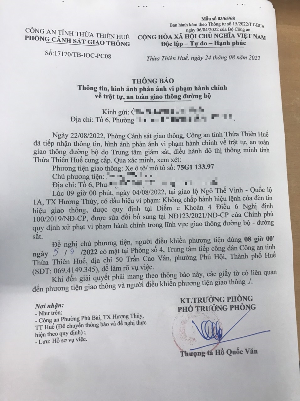 Vào lúc 09 giờ 00 phút, ngày 04/08/2022 Xe máy mang biển kiểm soát 75G113397 Không chấp hành hiệu lệnh của đèn tín hiệu giao thông tại địa điểm Ngô Thế Vinh - QL1A