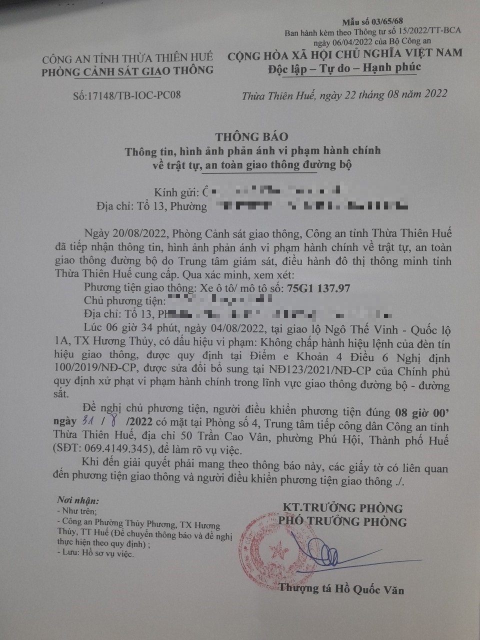 Vào lúc 06 giờ 34 phút, ngày 04/08/2022 Xe máy mang biển kiểm soát 75G113797 Không chấp hành hiệu lệnh của đèn tín hiệu giao thông tại địa điểm Ngô Thế Vinh - QL1A