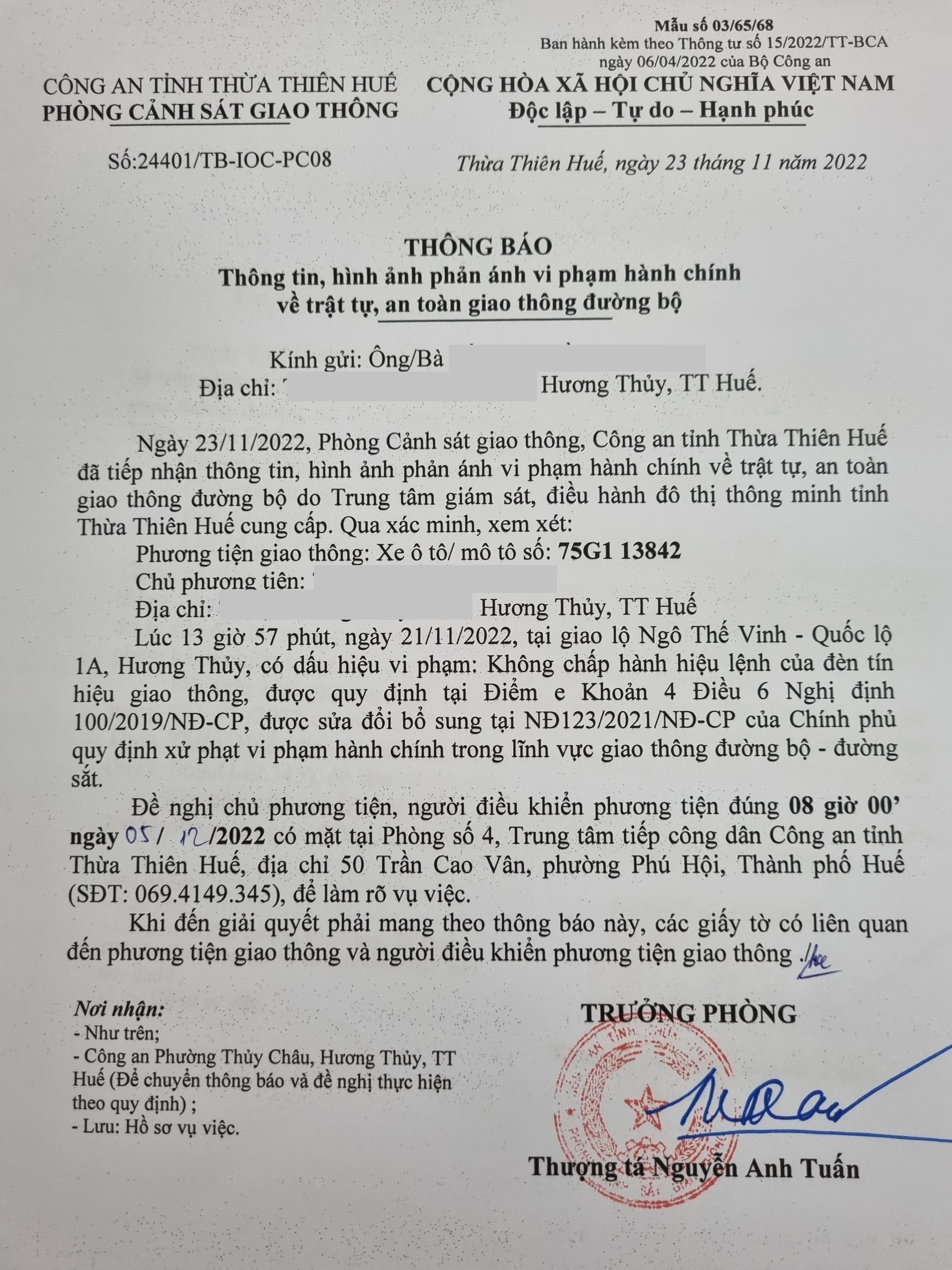 Phòng Cảnh sát giao thông xác định lỗi vi phạm của người điều khiển phương tiện 75G113842: Không chấp hành hiệu lệnh đèn tín hiệu giao thông, quy định tại điểm e, khoản 4, điều 6 Nghị định 100/2019/NĐ-CP được sửa đổi, bổ sung tại NĐ 123/2021/NĐ-CP.