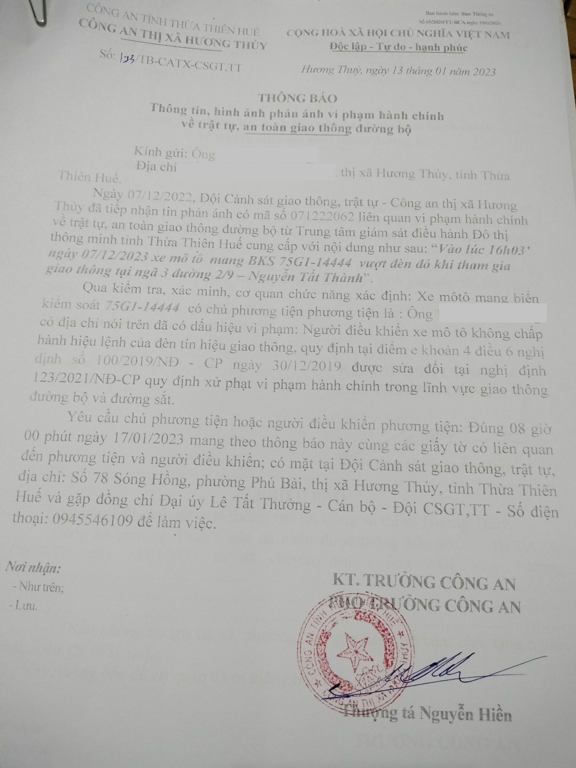 Qua hình ảnh được cung cấp, xác định người điều khiển phương tiện 75G114444 vi phạm lỗi: Không chấp hành hiệu lệnh của đèn tín hiệu giao thông (quy định tại điểm e, khoản 4, Điều 6 Nghị định 100/2019/NĐ-CP, sửa đổi bổ sung tại Nghị định 123/2021/NĐ-CP). Công an thị xã Hương Thủy đã gửi thông báo, yêu cầu chủ phương tiện đến làm việc theo quy định. Tuy nhiên, hiện chủ phương tiện vẫn chưa trình diện tại cơ quan. Đồng thời theo hình ảnh và video cung cấp chưa đủ căn cứ xác định người điều khiển phương tiện có vi phạm lỗi “Không đội mũ bảo hiểm”. Công an thị xã Hương Thủy sẽ tiếp tục thông báo Công an phường, xã nơi chủ phương tiện thường trú; đồng thời, thông báo các tổ tuần tra kiểm soát trên địa bàn, trong quá trình làm nhiệm vụ nếu phát hiện sẽ tiến hành dừng xe để xử lý.