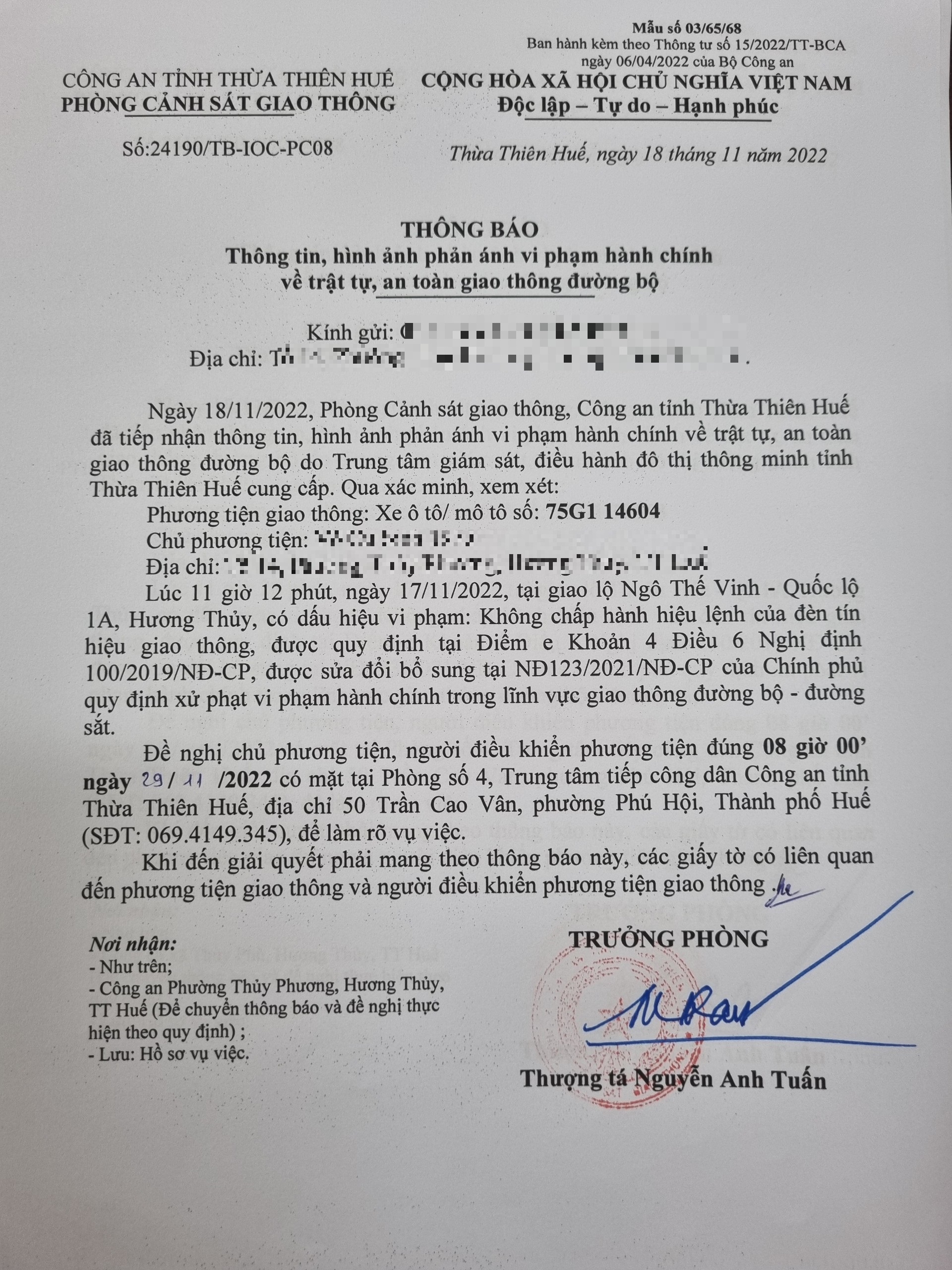 Phòng Cảnh sát giao thông xác định lỗi vi phạm của người điều khiển phương tiện 75G114604: Không chấp hành hiệu lệnh đèn tín hiệu giao thông, quy định tại điểm e, khoản 4, điều 6 Nghị định 100/2019/NĐ-CP được sửa đổi, bổ sung tại NĐ 123/2021/NĐ-CP.