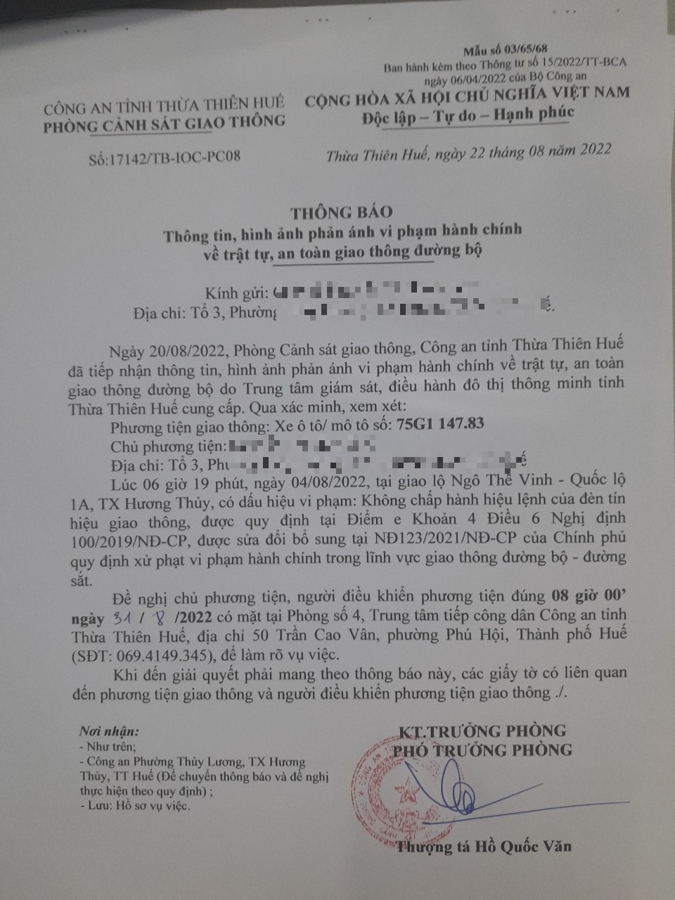 Vào lúc 06 giờ 19 phút, ngày 04/08/2022 Xe máy mang biển kiểm soát 75G114783 Không chấp hành hiệu lệnh của đèn tín hiệu giao thông tại địa điểm Ngô Thế Vinh - QL1A