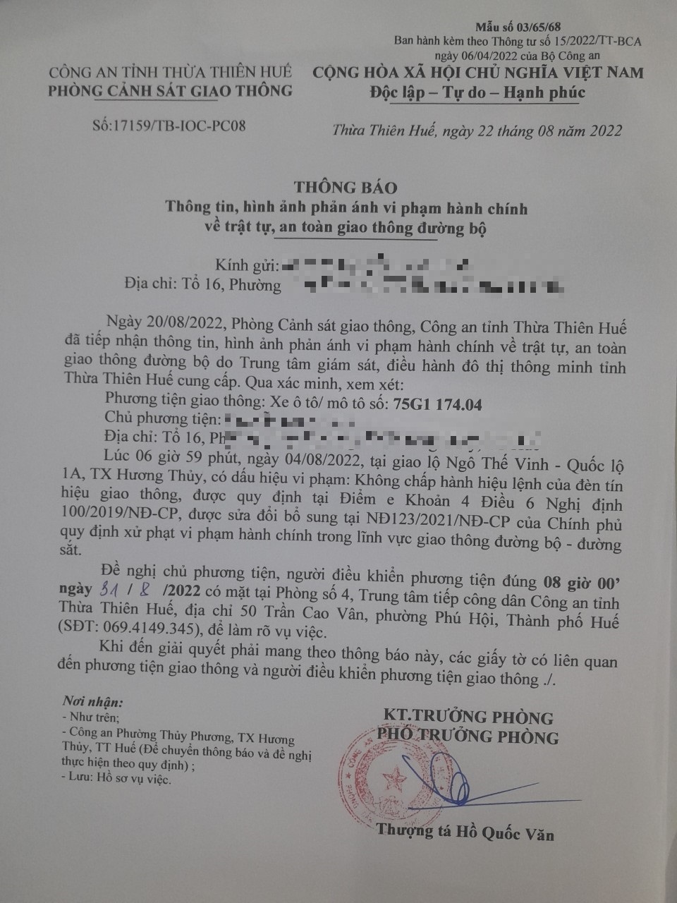 Vào lúc 06 giờ 59 phút, ngày 04/08/2022 Xe máy mang biển kiểm soát 75G117404 Không chấp hành hiệu lệnh của đèn tín hiệu giao thông tại địa điểm Ngô Thế Vinh - QL1A