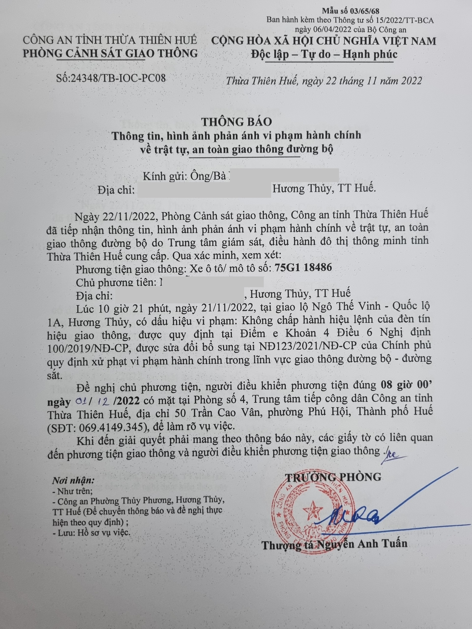 Phòng Cảnh sát giao thông xác định lỗi vi phạm của người điều khiển phương tiện 75G118486: Không chấp hành hiệu lệnh đèn tín hiệu giao thông, quy định tại điểm e, khoản 4, điều 6 Nghị định 100/2019/NĐ-CP được sửa đổi, bổ sung tại NĐ 123/2021/NĐ-CP.
