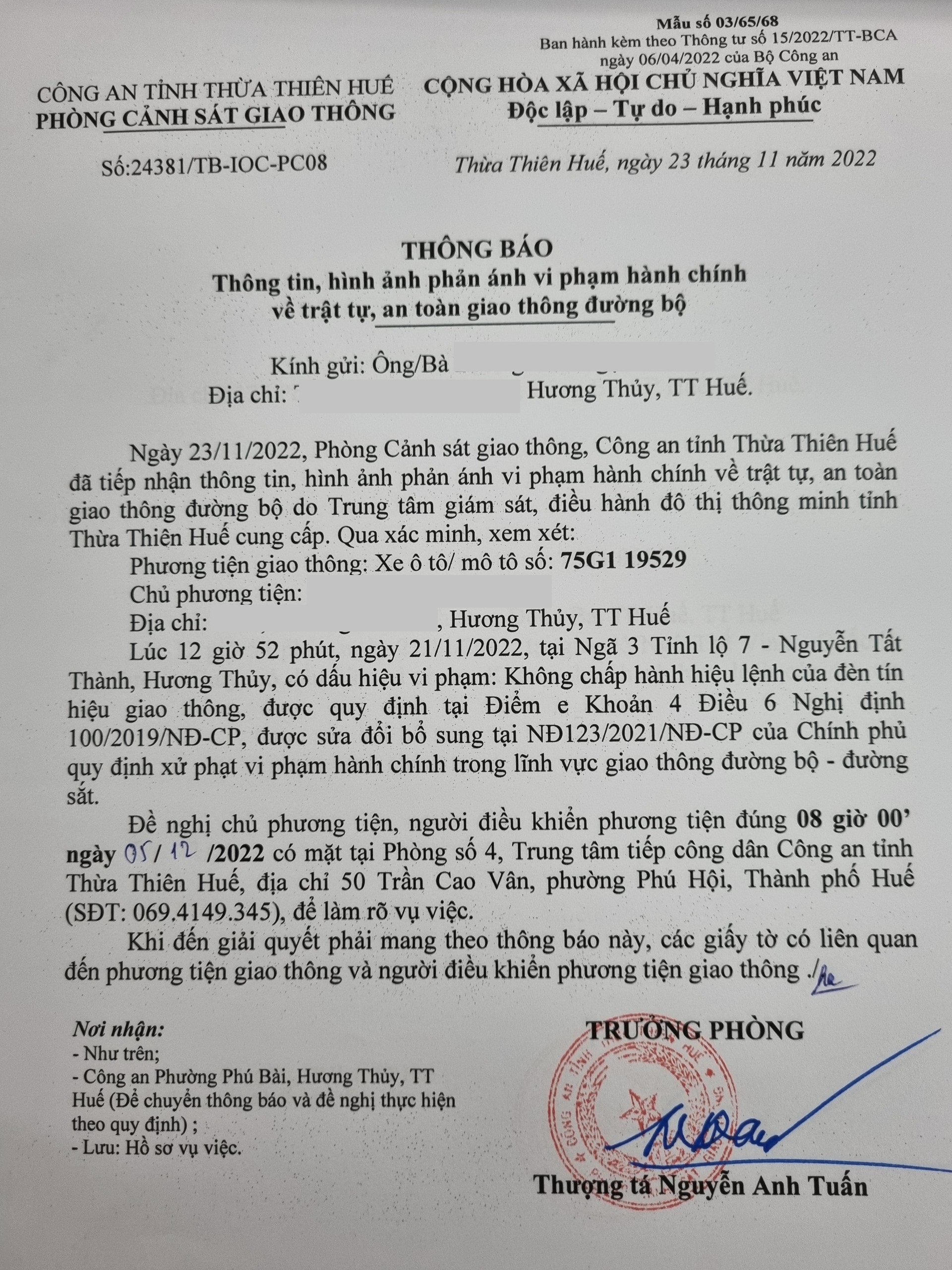 Phòng Cảnh sát giao thông xác định lỗi vi phạm của người điều khiển phương tiện 75G119529: Không chấp hành hiệu lệnh đèn tín hiệu giao thông, quy định tại điểm e, khoản 4, điều 6 Nghị định 100/2019/NĐ-CP được sửa đổi, bổ sung tại NĐ 123/2021/NĐ-CP.