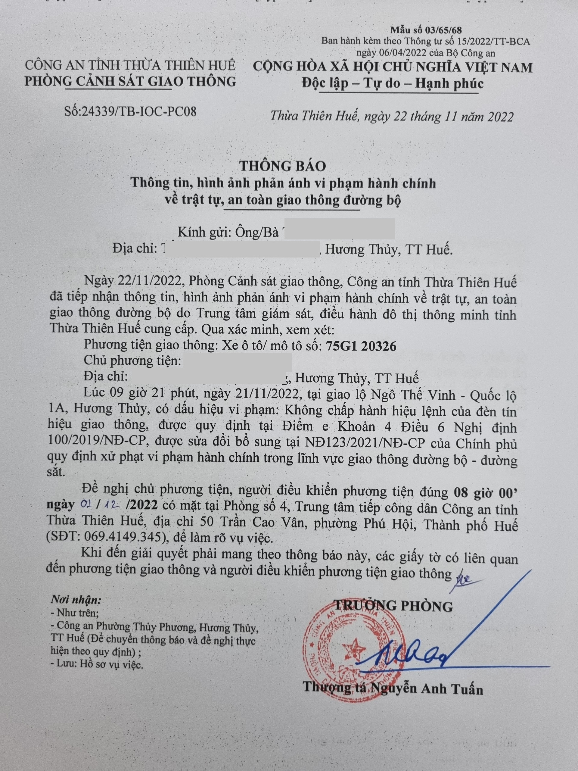 Phòng Cảnh sát giao thông xác định lỗi vi phạm của người điều khiển phương tiện 75G120326: Không chấp hành hiệu lệnh đèn tín hiệu giao thông, quy định tại điểm e, khoản 4, điều 6 Nghị định 100/2019/NĐ-CP được sửa đổi, bổ sung tại NĐ 123/2021/NĐ-CP.