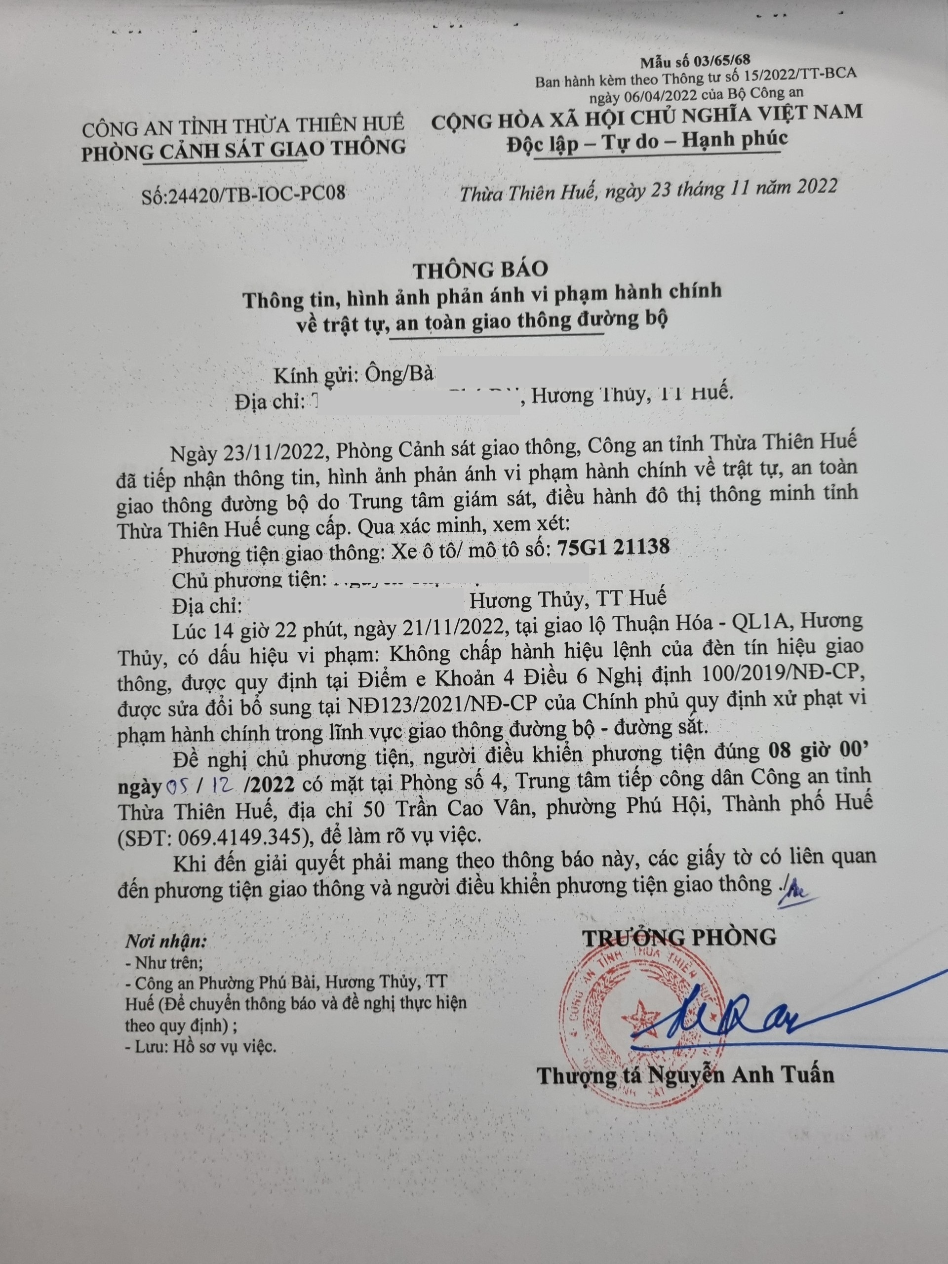 Phòng Cảnh sát giao thông xác định lỗi vi phạm của người điều khiển phương tiện 75G121138: Không chấp hành hiệu lệnh đèn tín hiệu giao thông, quy định tại điểm e, khoản 4, điều 6 Nghị định 100/2019/NĐ-CP được sửa đổi, bổ sung tại NĐ 123/2021/NĐ-CP.