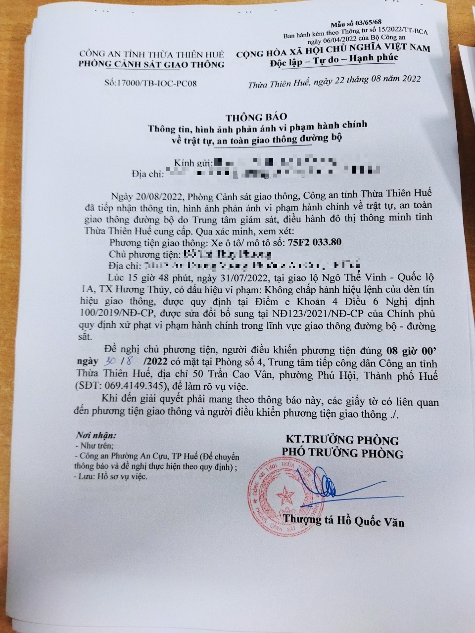 Vào lúc 15 giờ 10 phút, ngày 03/08/2022 Xe máy mang biển kiểm soát 75G123380 Không chấp hành hiệu lệnh của đèn tín hiệu giao thông tại địa điểm Ngô Thế Vinh - QL1A