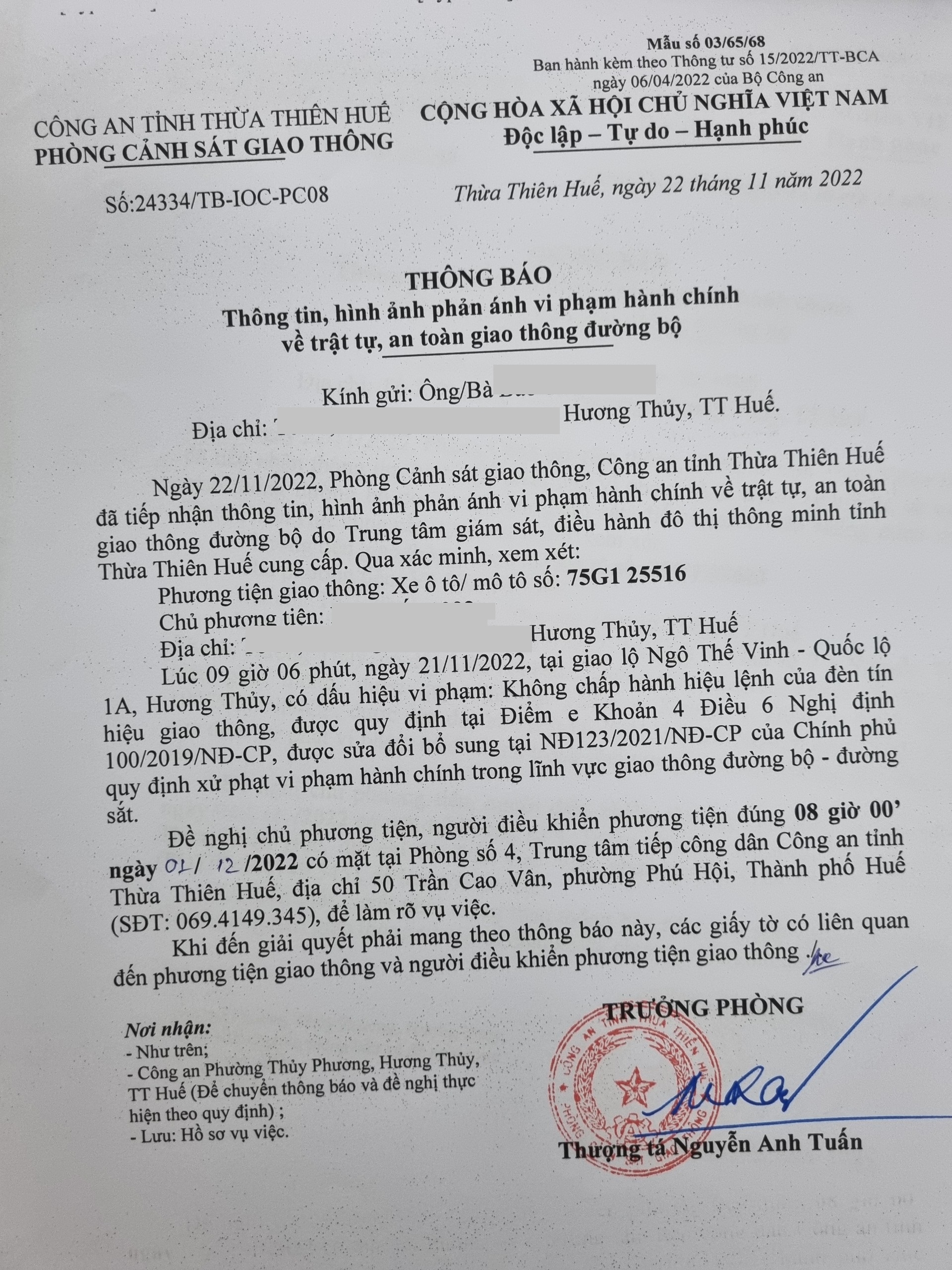 Phòng Cảnh sát giao thông xác định lỗi vi phạm của người điều khiển phương tiện 75G125516: Không chấp hành hiệu lệnh đèn tín hiệu giao thông, quy định tại điểm e, khoản 4, điều 6 Nghị định 100/2019/NĐ-CP được sửa đổi, bổ sung tại NĐ 123/2021/NĐ-CP.