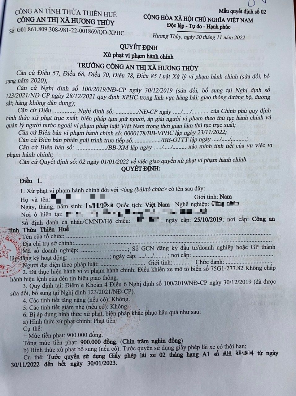 Công an thị xã đã tiến hành lập biên bản, ra quyết định xử phạt vi phạm hành chính đối với chủ phương tiện về lỗi trên, phạt tiền 900.000 đồng, tước giấy phép lái xe 02 tháng.