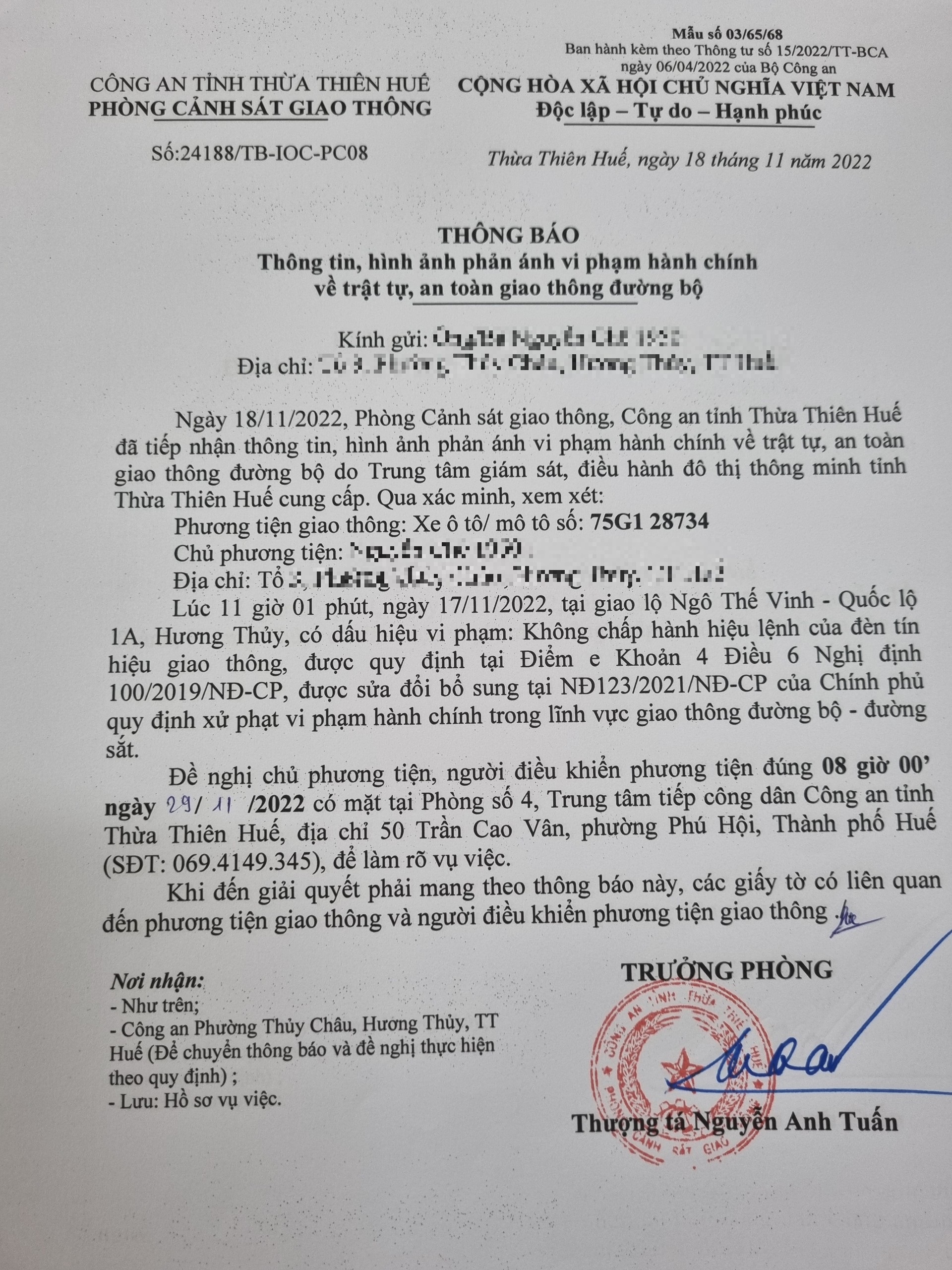 Phòng Cảnh sát giao thông xác định lỗi vi phạm của người điều khiển phương tiện 75G128734: Không chấp hành hiệu lệnh đèn tín hiệu giao thông, quy định tại điểm e, khoản 4, điều 6 Nghị định 100/2019/NĐ-CP được sửa đổi, bổ sung tại NĐ 123/2021/NĐ-CP.
