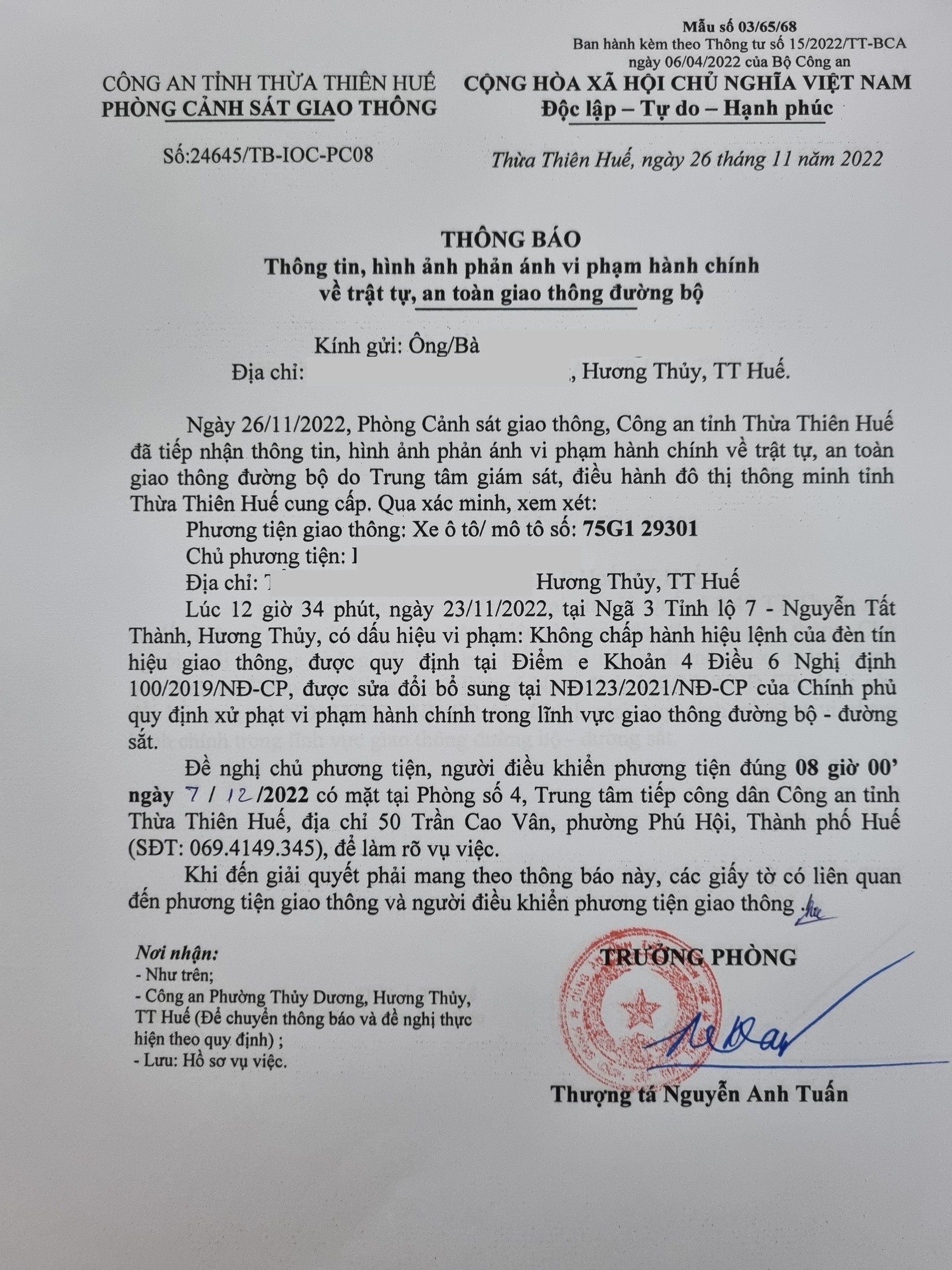Phòng Cảnh sát giao thông xác định lỗi vi phạm của người điều khiển phương tiện 75G129301: Không chấp hành hiệu lệnh đèn tín hiệu giao thông, quy định tại điểm e, khoản 4, điều 6 Nghị định 100/2019/NĐ-CP được sửa đổi, bổ sung tại NĐ 123/2021/NĐ-CP.