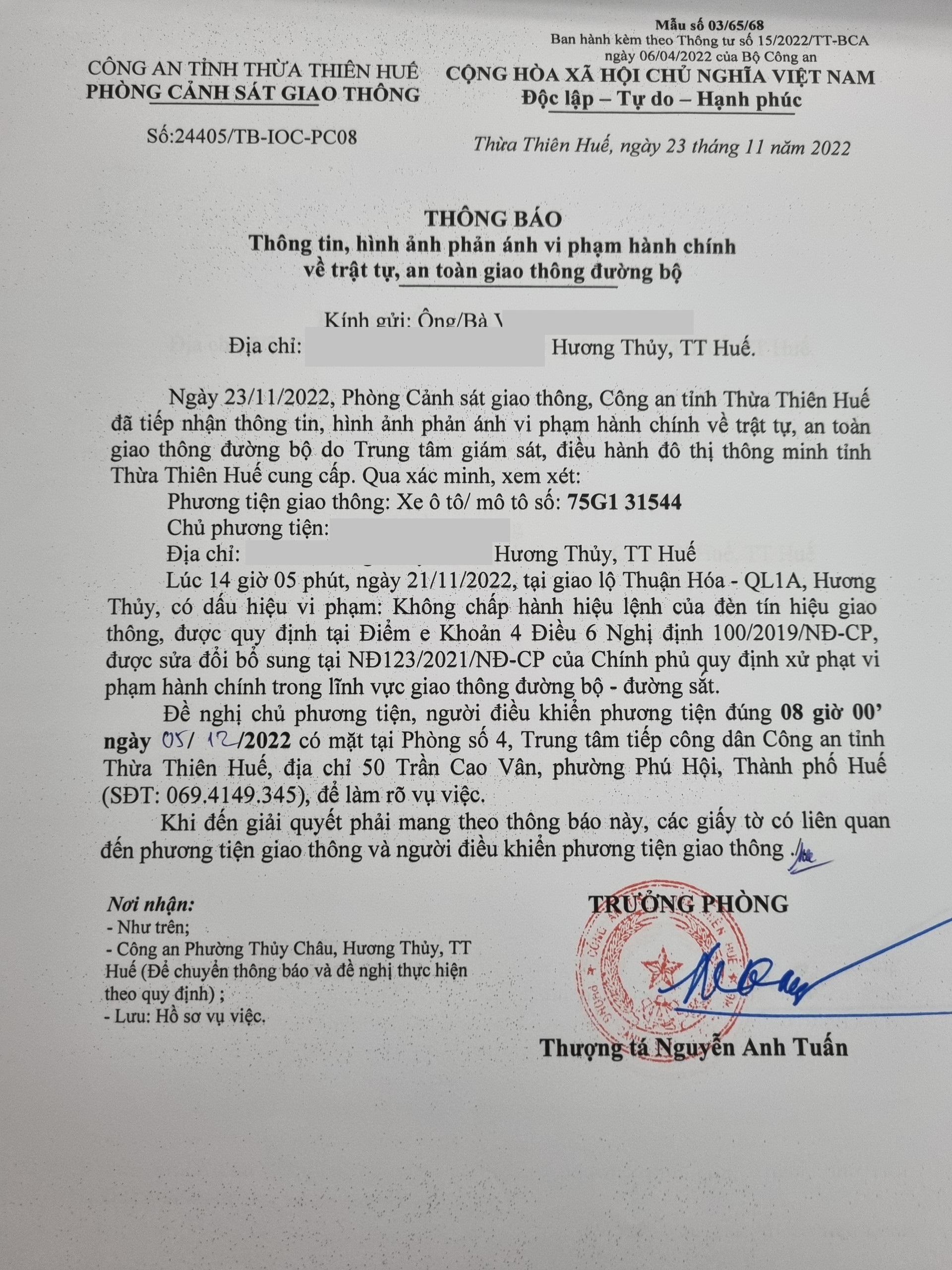 Phòng Cảnh sát giao thông xác định lỗi vi phạm của người điều khiển phương tiện 75G131544: Không chấp hành hiệu lệnh đèn tín hiệu giao thông, quy định tại điểm e, khoản 4, điều 6 Nghị định 100/2019/NĐ-CP được sửa đổi, bổ sung tại NĐ 123/2021/NĐ-CP.