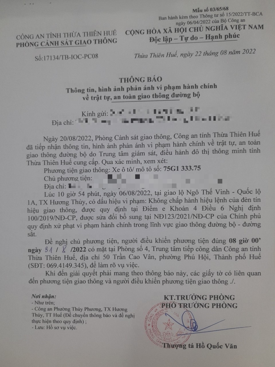 Vào lúc 10 giờ 54 phút, ngày 06/08/2022 Xe máy mang biển kiểm soát 75G133375 Không chấp hành hiệu lệnh của đèn tín hiệu giao thông tại địa điểm Ngô Thế Vinh - QL1A