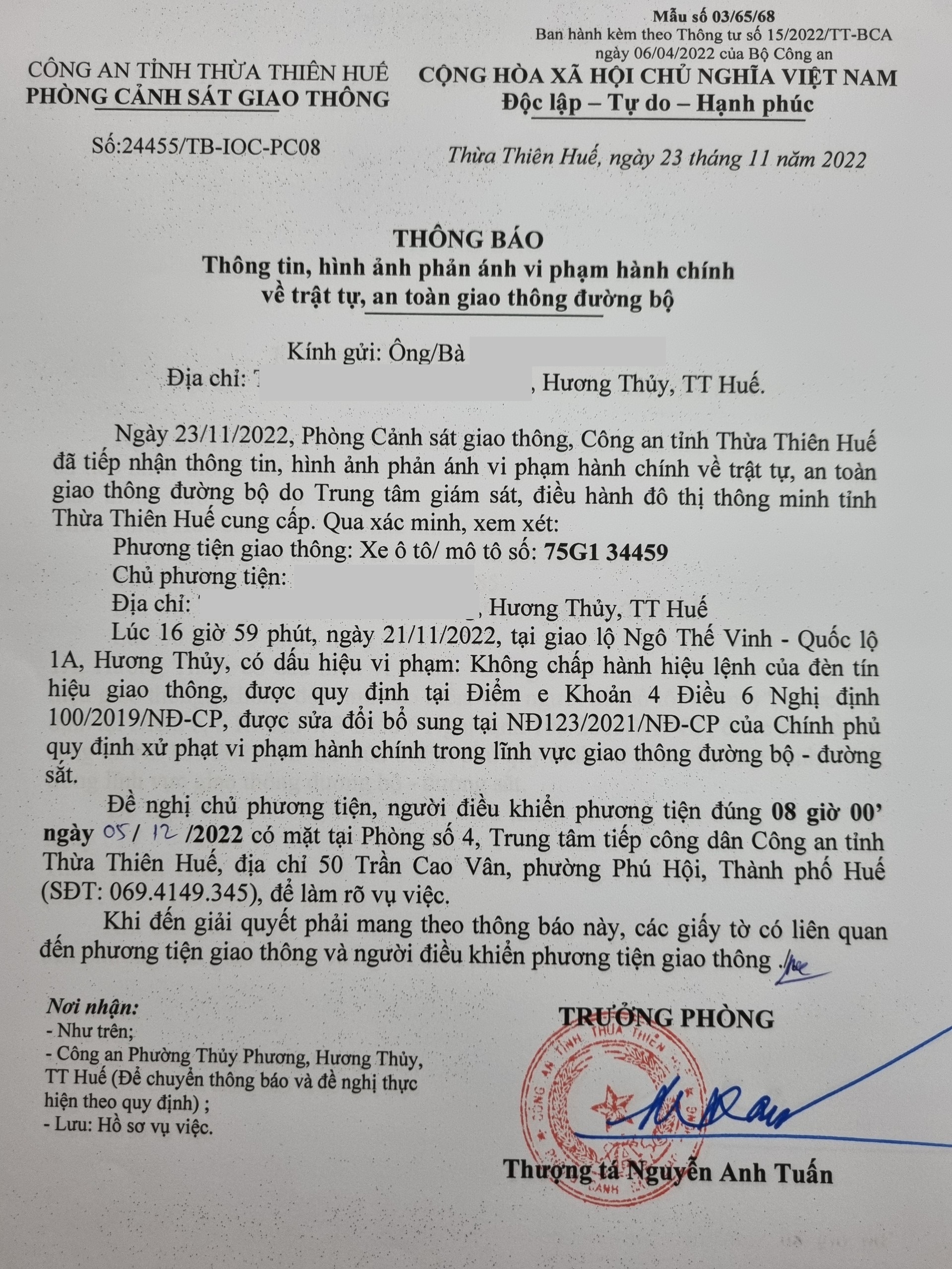 Phòng Cảnh sát giao thông xác định lỗi vi phạm của người điều khiển phương tiện 75G134459: Không chấp hành hiệu lệnh đèn tín hiệu giao thông, quy định tại điểm e, khoản 4, điều 6 Nghị định 100/2019/NĐ-CP được sửa đổi, bổ sung tại NĐ 123/2021/NĐ-CP.