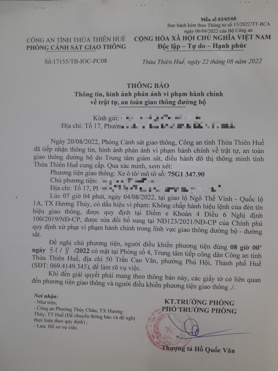 Vào lúc 07 giờ 04 phút, ngày 04/08/2022 Xe máy mang biển kiểm soát 75G134790 Không chấp hành hiệu lệnh của đèn tín hiệu giao thông tại địa điểm Ngô Thế Vinh - QL1A