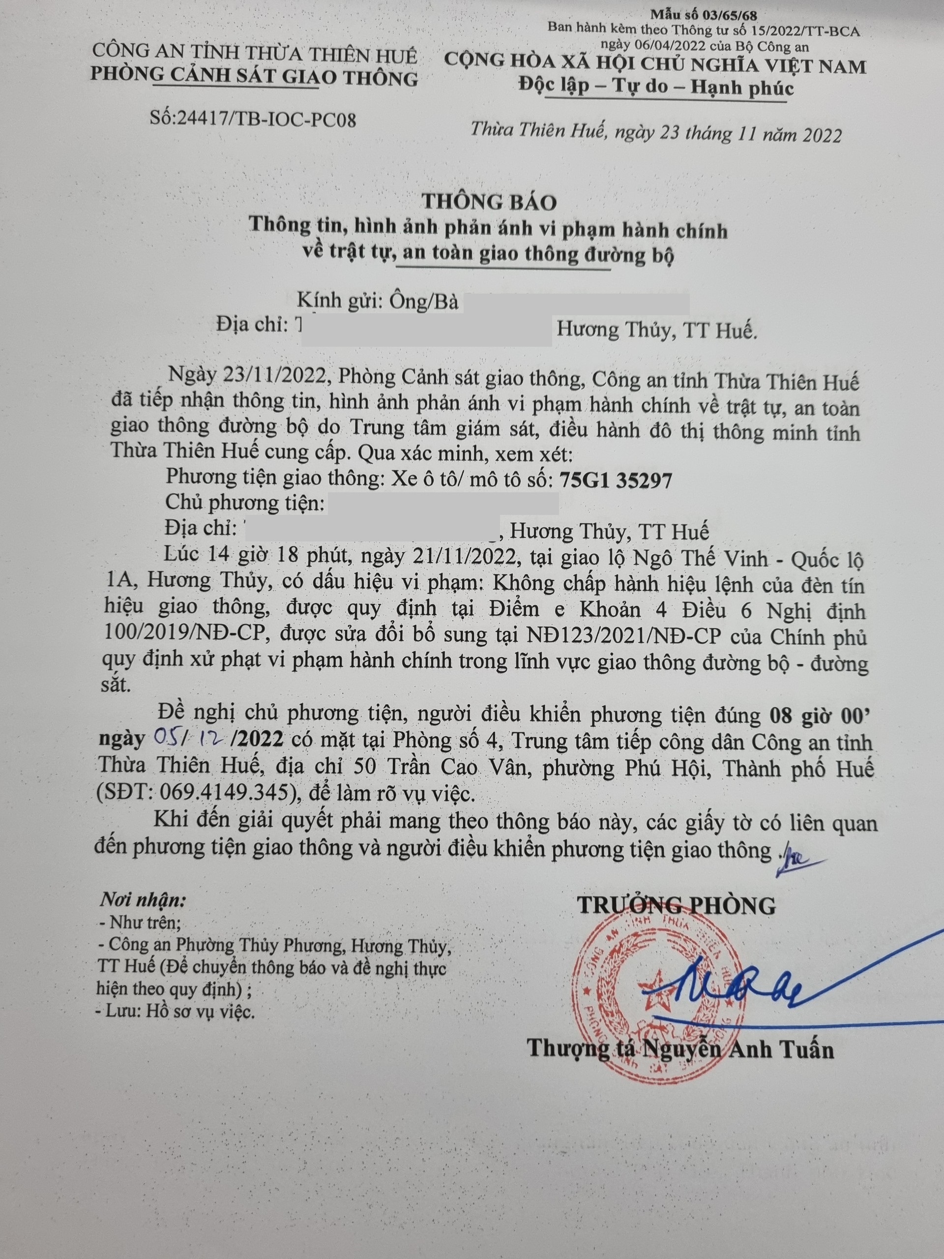 Phòng Cảnh sát giao thông xác định lỗi vi phạm của người điều khiển phương tiện 75G135297: Không chấp hành hiệu lệnh đèn tín hiệu giao thông, quy định tại điểm e, khoản 4, điều 6 Nghị định 100/2019/NĐ-CP được sửa đổi, bổ sung tại NĐ 123/2021/NĐ-CP.