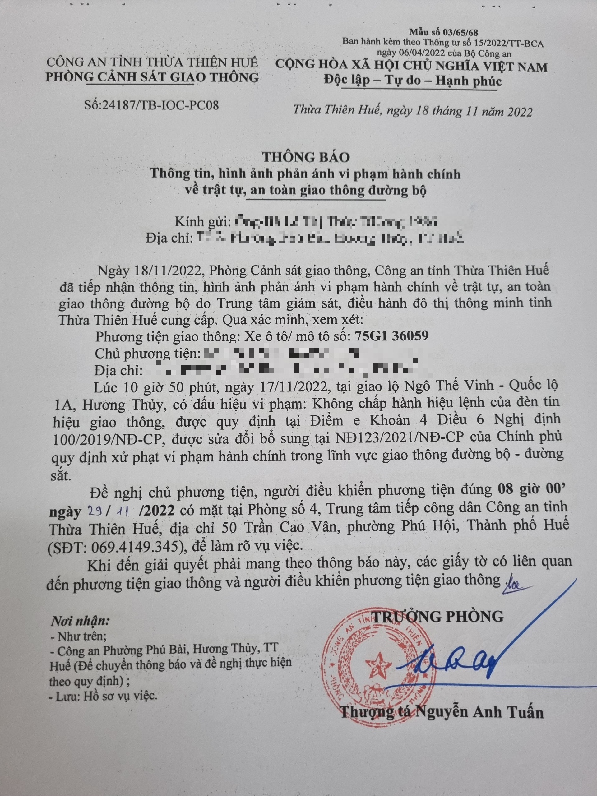 Phòng Cảnh sát giao thông xác định lỗi vi phạm của người điều khiển phương tiện 75G136059: Không chấp hành hiệu lệnh đèn tín hiệu giao thông, quy định tại điểm e, khoản 4, điều 6 Nghị định 100/2019/NĐ-CP được sửa đổi, bổ sung tại NĐ 123/2021/NĐ-CP.