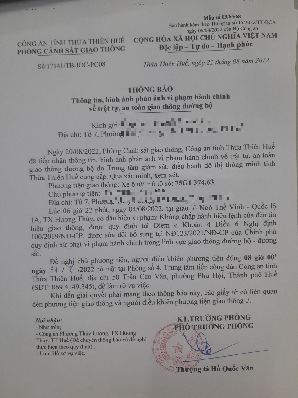 Vào lúc 06 giờ 22 phút, ngày 04/08/2022 Xe máy mang biển kiểm soát 75G137463 Không chấp hành hiệu lệnh của đèn tín hiệu giao thông tại địa điểm Ngô Thế Vinh - QL1A