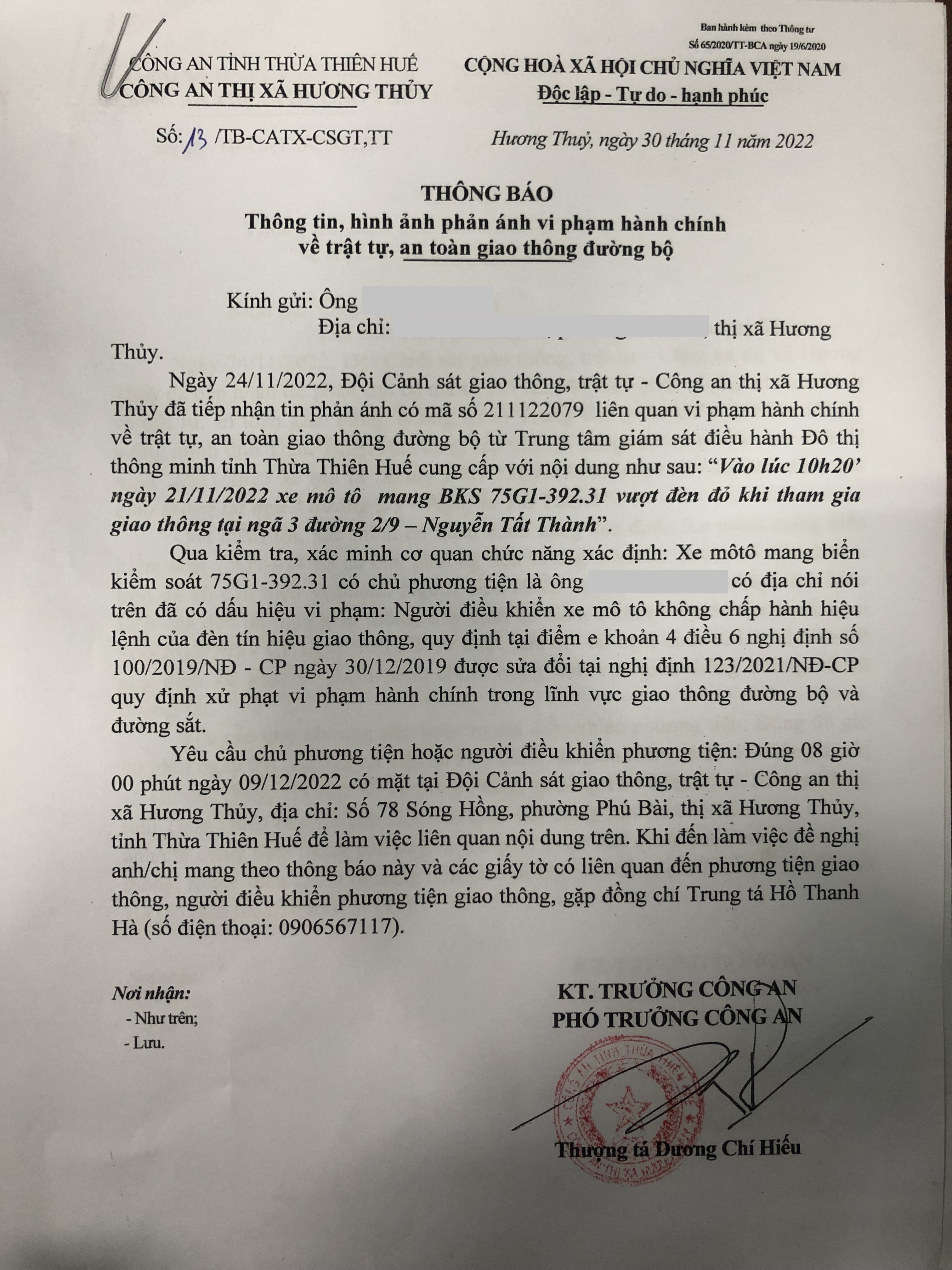 Vấn đề Ông/Bà phản ánh, Công an tỉnh đã chỉ đạo Công an thị xã Hương Thủy xin thông báo kết quả xử lý như sau: