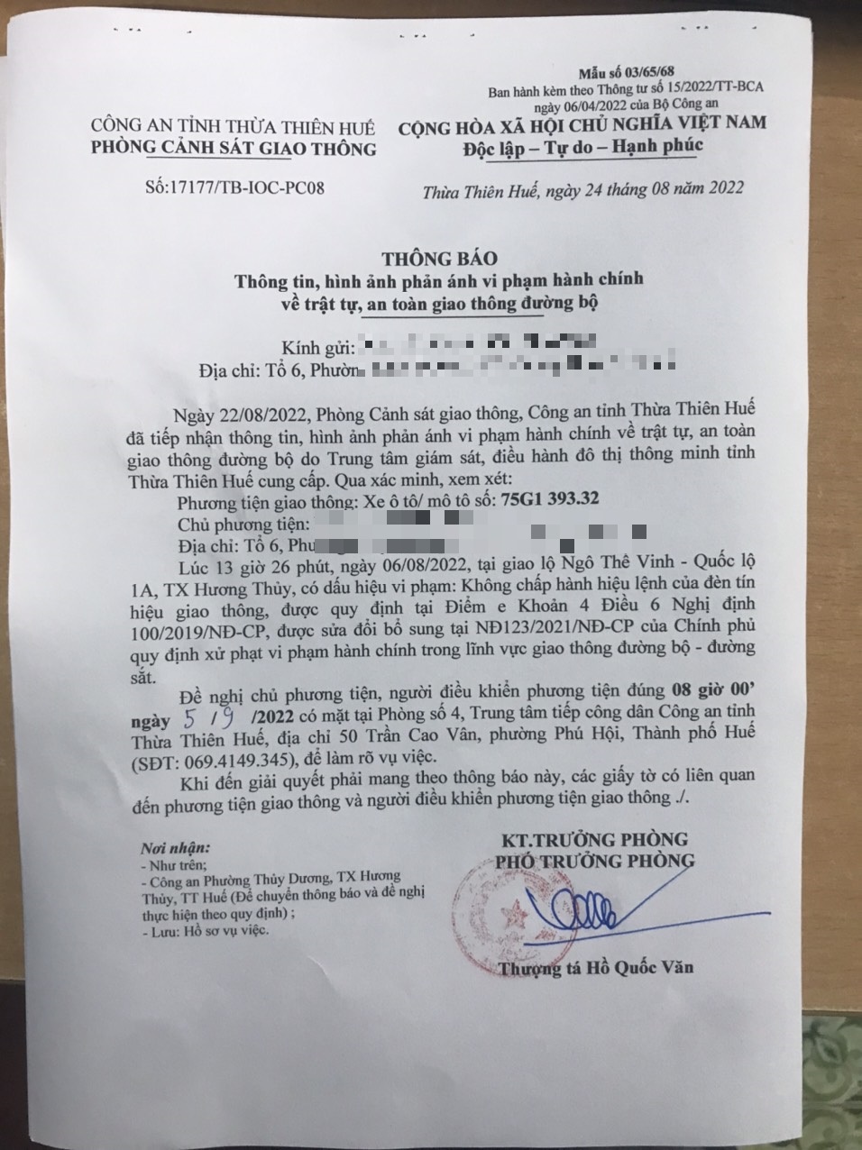 Vào lúc 13 giờ 26 phút, ngày 06/08/2022 Xe máy mang biển kiểm soát 75G139332 Không chấp hành hiệu lệnh của đèn tín hiệu giao thông tại địa điểm Ngô Thế Vinh - QL1A