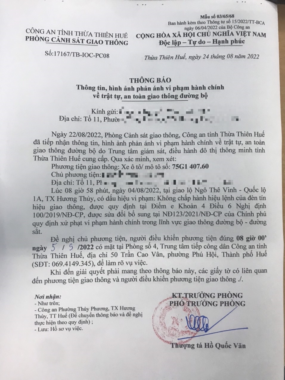 Vào lúc 08 giờ 58 phút, ngày 04/08/2022 Xe máy mang biển kiểm soát 75G140760 Không chấp hành hiệu lệnh của đèn tín hiệu giao thông tại địa điểm Ngô Thế Vinh - QL1A