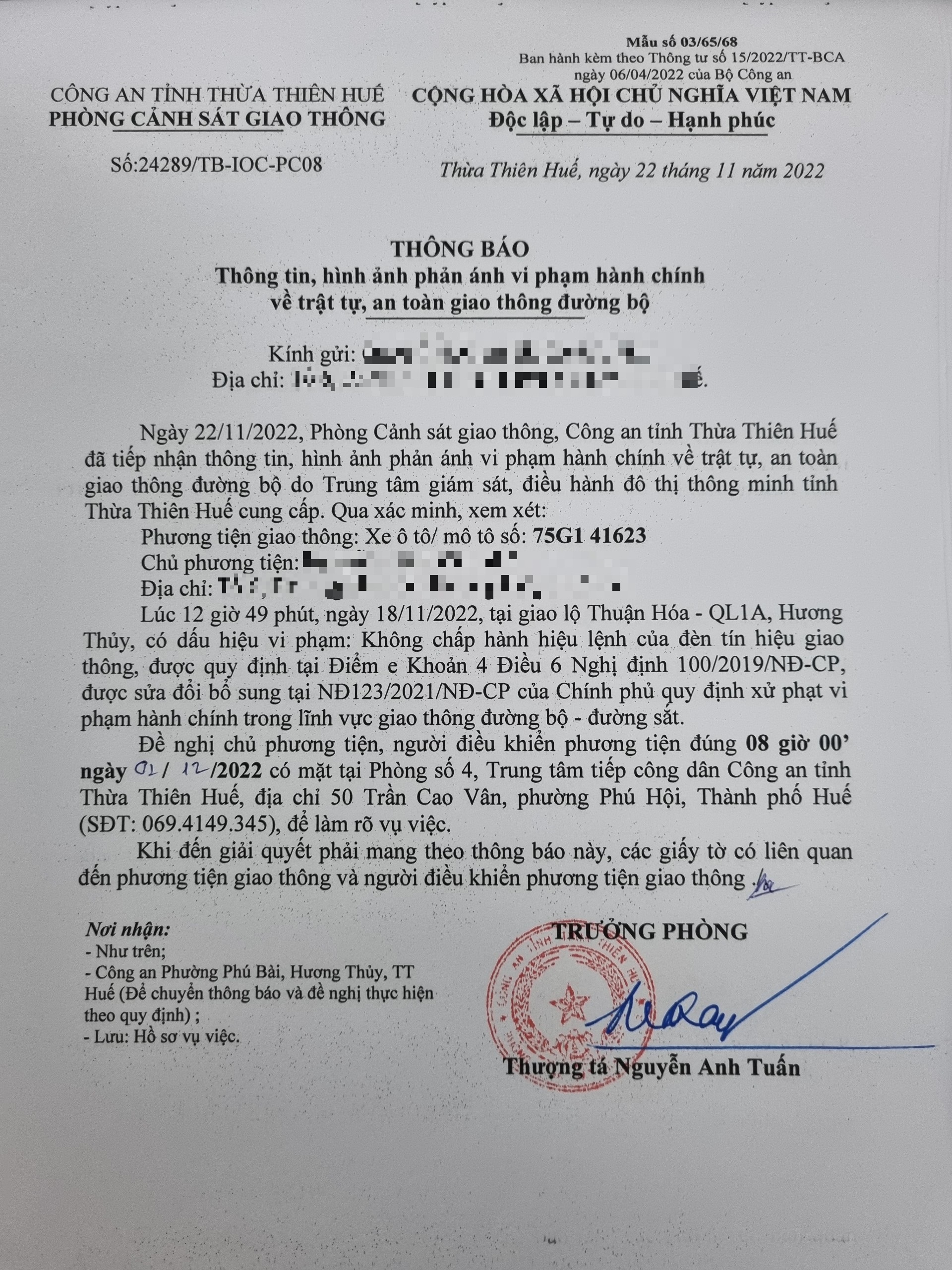 Phòng Cảnh sát giao thông xác định lỗi vi phạm của người điều khiển phương tiện 75G141623: Không chấp hành hiệu lệnh đèn tín hiệu giao thông, quy định tại điểm e, khoản 4, điều 6 Nghị định 100/2019/NĐ-CP được sửa đổi, bổ sung tại NĐ 123/2021/NĐ-CP.