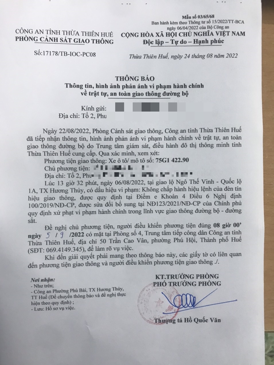 Vào lúc 13 giờ 32 phút, ngày 06/08/2022 Xe máy mang biển kiểm soát 75G142290 Không chấp hành hiệu lệnh của đèn tín hiệu giao thông tại địa điểm Ngô Thế Vinh - QL1A