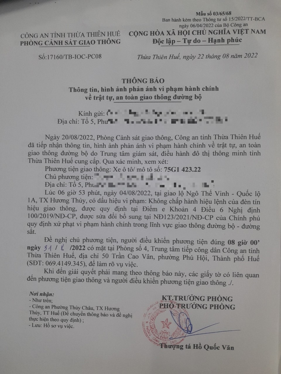Vào lúc 06 giờ 53 phút, ngày 04/08/2022 Xe máy mang biển kiểm soát 75G142322 Không chấp hành hiệu lệnh của đèn tín hiệu giao thông tại địa điểm Ngô Thế Vinh - QL1A