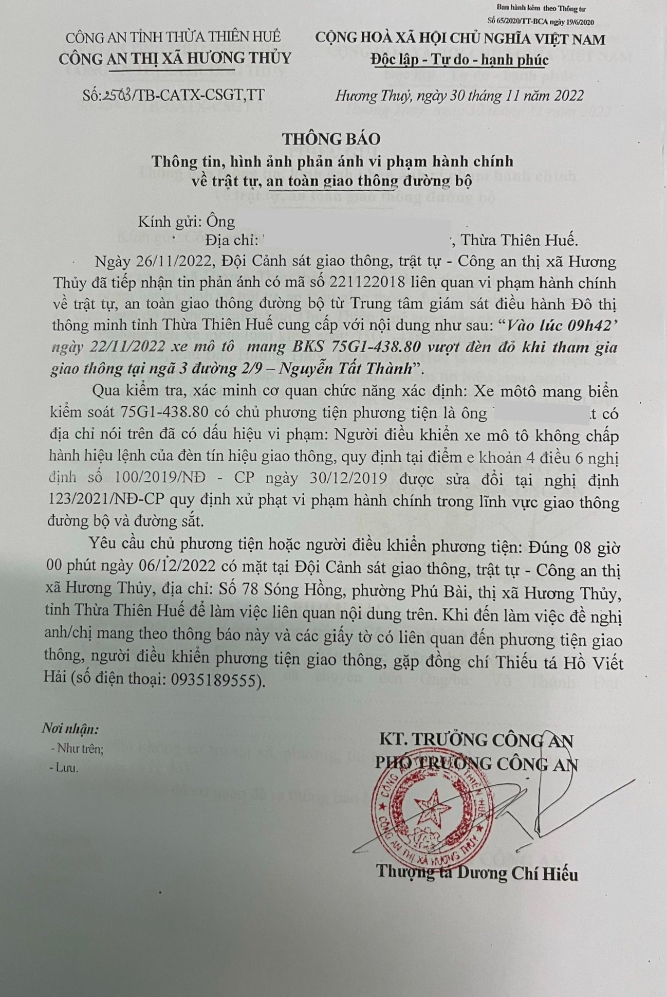 Vấn đề Ông/Bà phản ánh, Công an tỉnh đã chỉ đạo Công an thị xã Hương Thủy xin thông báo kết quả xử lý như sau: