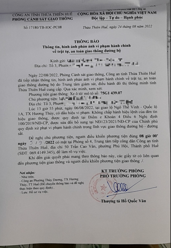 Vào lúc 13 giờ 55 phút, ngày 06/08/2022 Xe máy mang biển kiểm soát 75G143907 Không chấp hành hiệu lệnh của đèn tín hiệu giao thông tại địa điểm Ngô Thế Vinh - QL1A