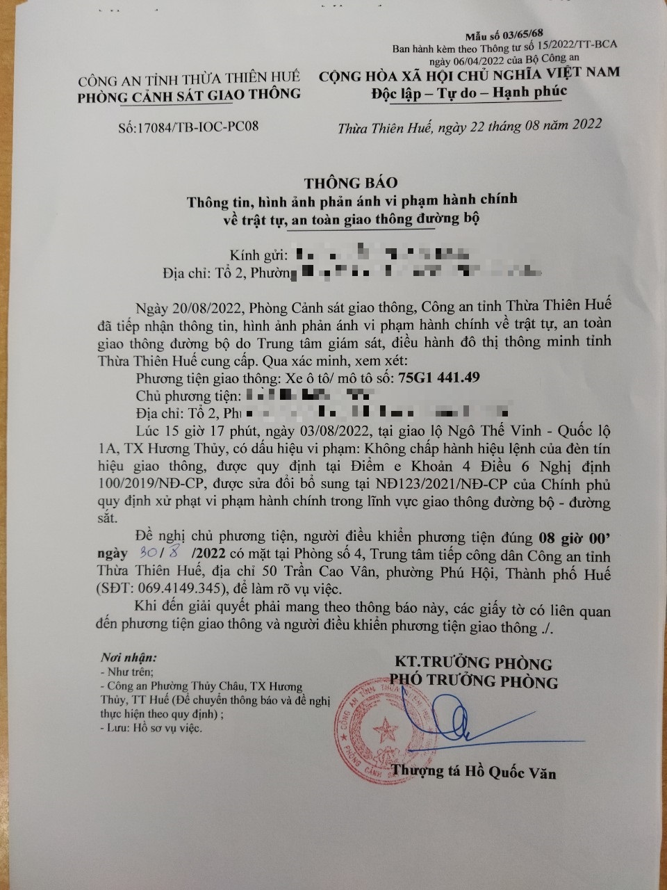Vào lúc 15 giờ 17 phút, ngày 03/08/2022 Xe máy mang biển kiểm soát 75G144149 Không chấp hành hiệu lệnh của đèn tín hiệu giao thông tại địa điểm Ngô Thế Vinh - QL1A