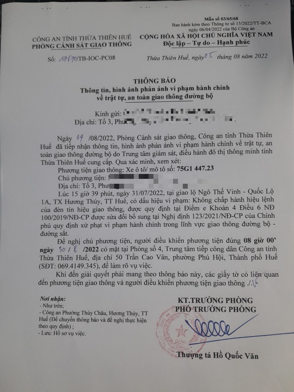 Vào lúc 15 giờ 39 phút, ngày 31/07/2022 Xe máy mang biển kiểm soát 75G144723 Không chấp hành hiệu lệnh của đèn tín hiệu giao thông tại địa điểm Ngô Thế Vinh - QL1A