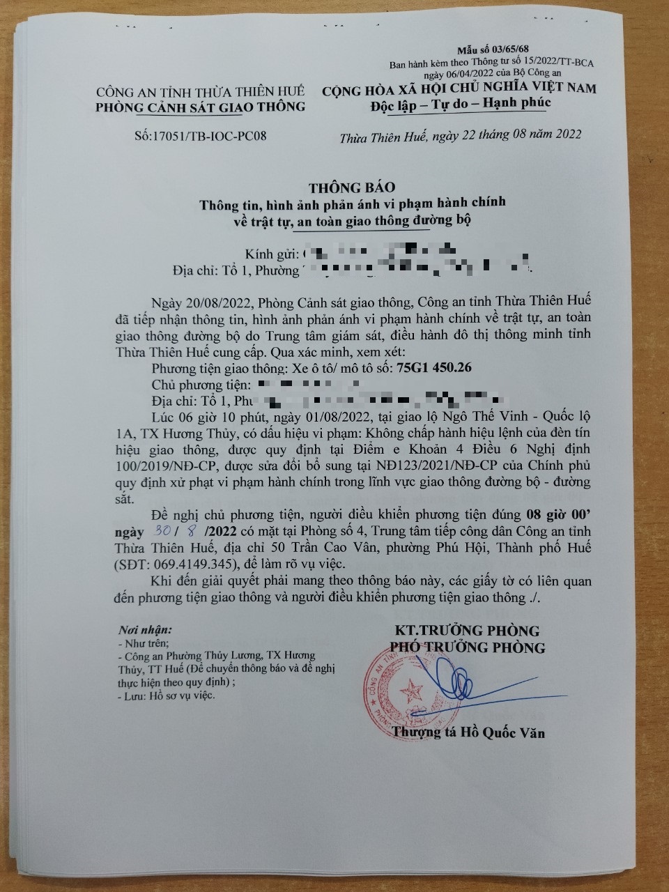 Vào lúc 06 giờ 10 phút, ngày 01/08/2022 Xe máy mang biển kiểm soát 75G145026 Không chấp hành hiệu lệnh của đèn tín hiệu giao thông tại địa điểm Ngô Thế Vinh - QL1A