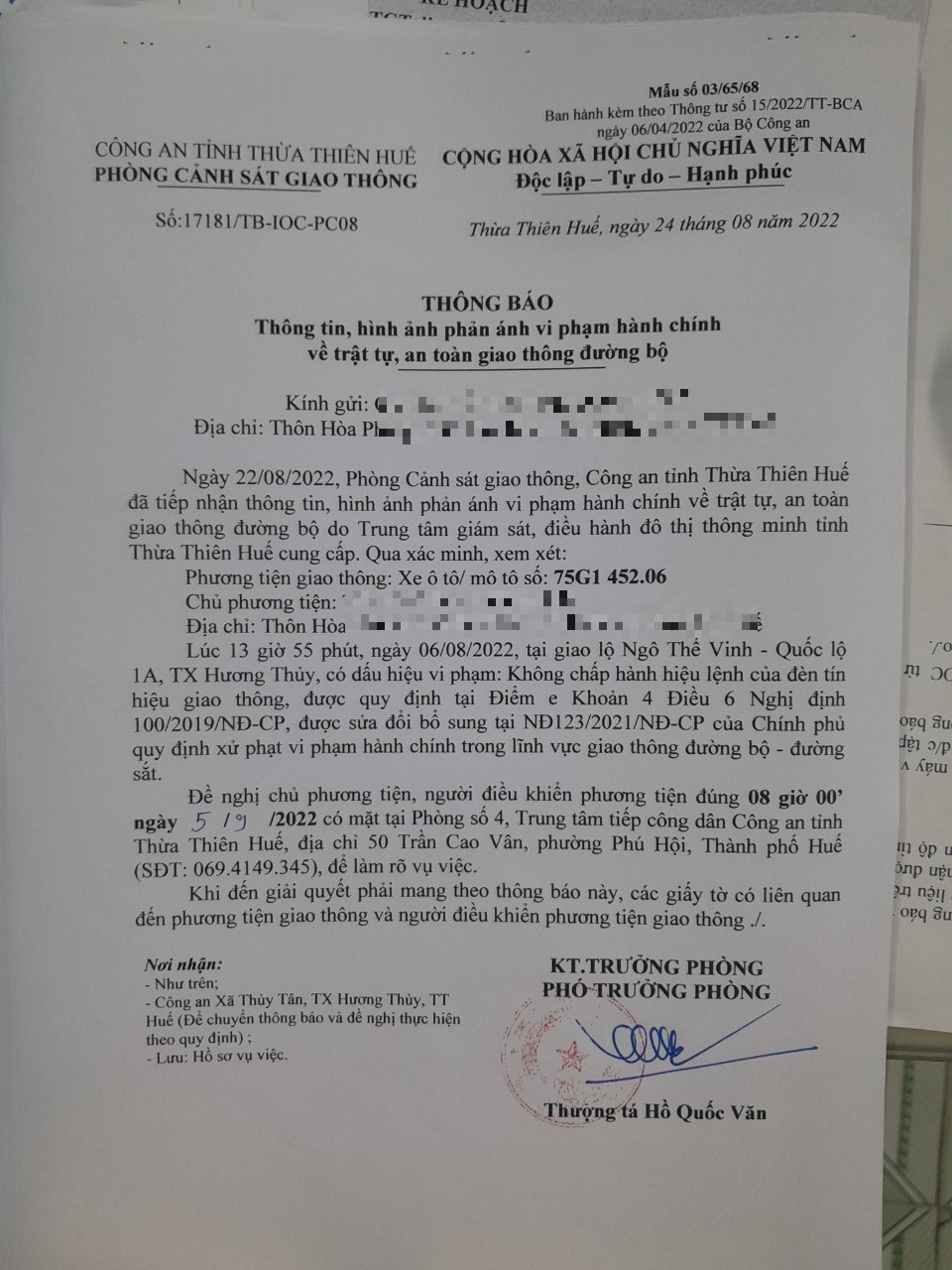 Vào lúc 13 giờ 55 phút, ngày 06/08/2022 Xe máy mang biển kiểm soát 75G145206 Không chấp hành hiệu lệnh của đèn tín hiệu giao thông tại địa điểm Ngô Thế Vinh - QL1A