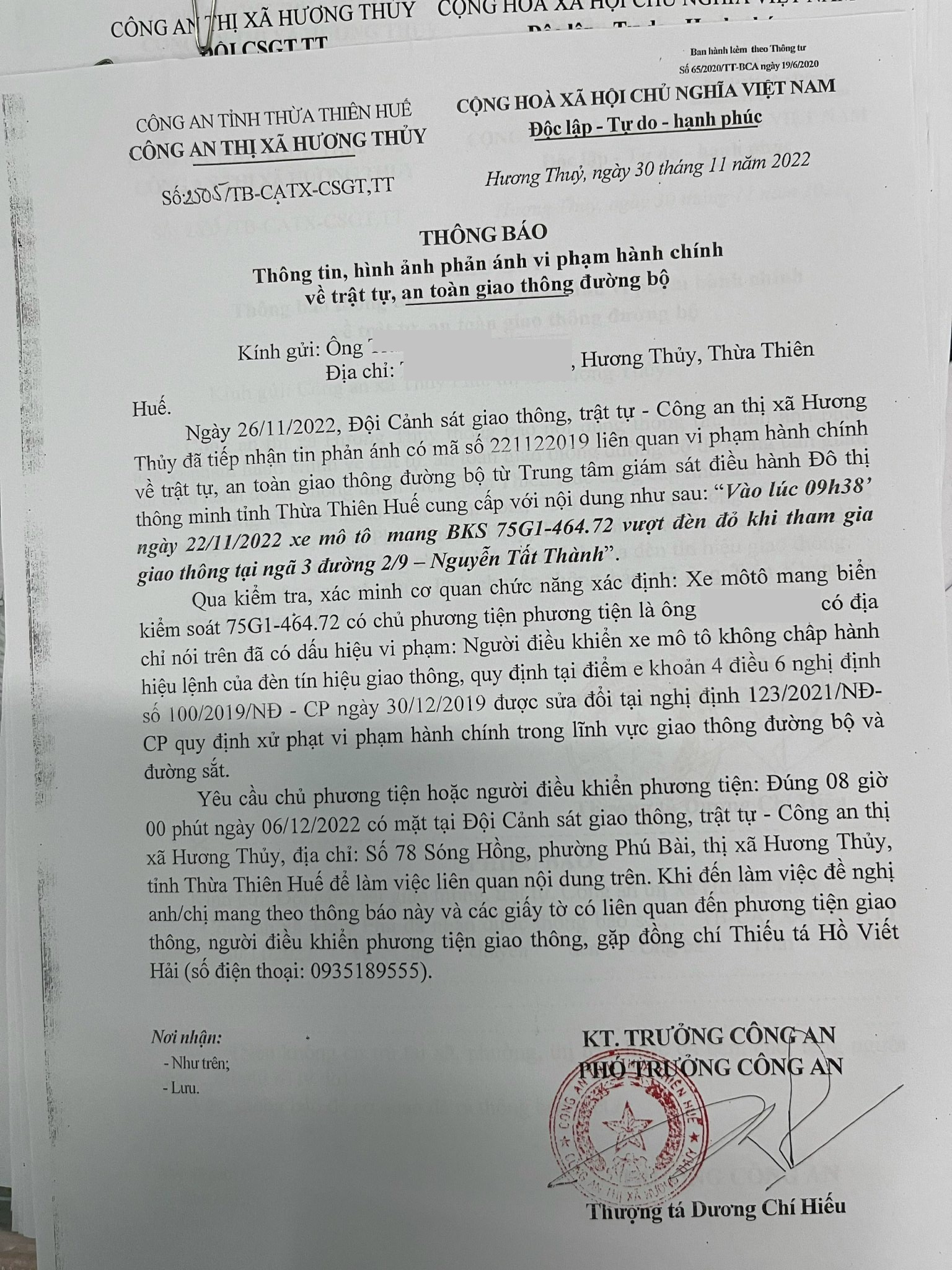 Công an thị xã Hương Thuỷ xác định lỗi vi phạm của người điều khiển phương tiện 75G146472: Không chấp hành hiệu lệnh đèn tín hiệu giao thông, quy định tại điểm e, khoản 4, điều 6 Nghị định 100/2019/NĐ-CP được sửa đổi, bổ sung tại NĐ 123/2021/NĐ-CP.