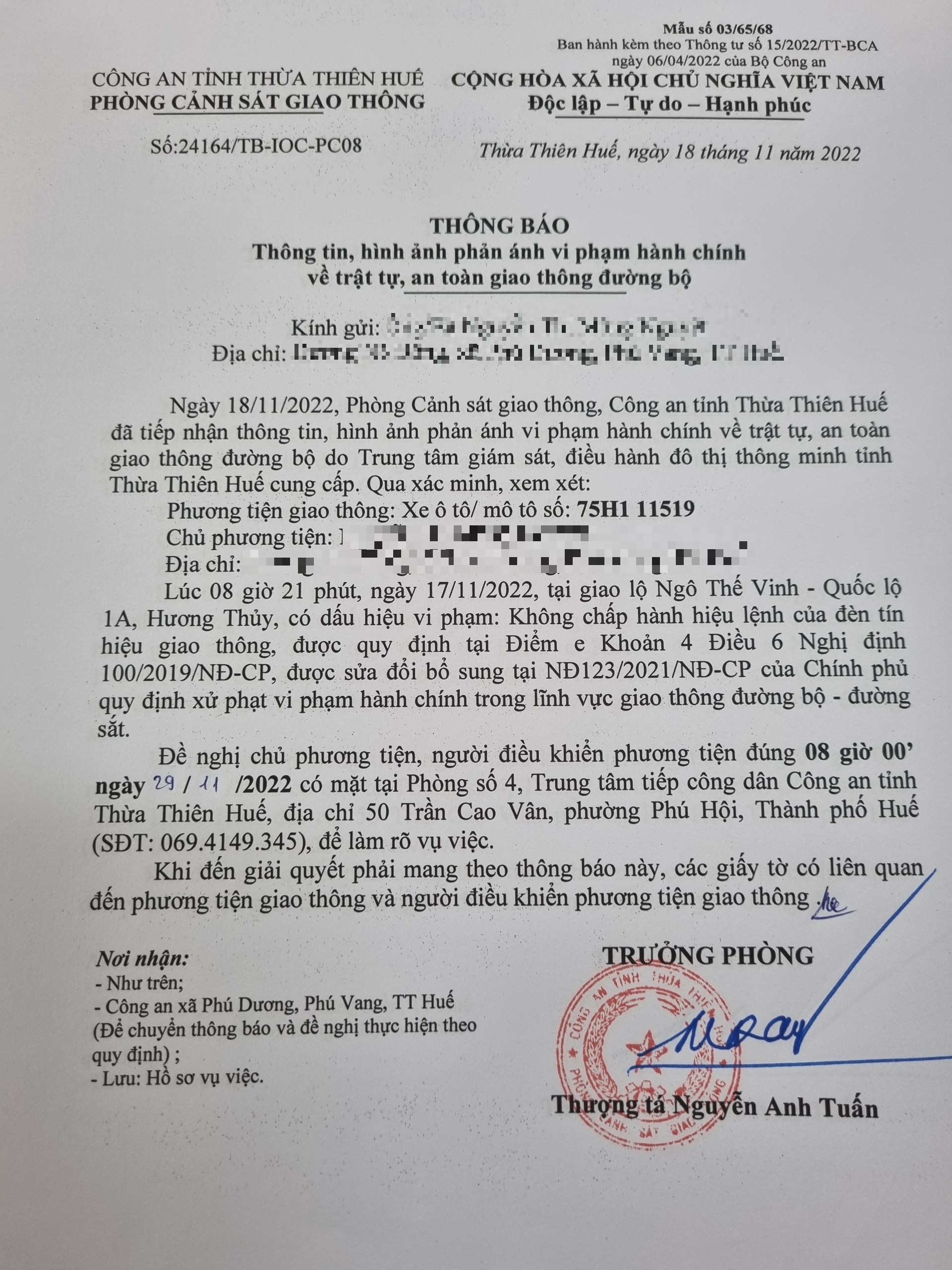 Qua hình ảnh được cung cấp, xác định người điều khiển phương tiện 75H111519 vi phạm lỗi: Không chấp hành hiệu lệnh của đèn tín hiệu giao thông (quy định tại điểm e, khoản 4, Điều 6 Nghị định 100/2019/NĐ-CP, sửa đổi bổ sung tại Nghị định 123/2021/NĐ-CP). Phòng Cảnh sát giao thông đã gửi thông báo, yêu cầu chủ phương tiện đến làm việc theo quy định. Tuy nhiên, hiện chủ phương tiện vẫn chưa trình diện tại cơ quan. Phòng Cảnh sát giao thông sẽ tiếp tục thông báo Công an địa phương nơi chủ phương tiện thường trú; đồng thời, thông báo các tổ tuần tra kiểm soát trên địa bàn, trong quá trình làm nhiệm vụ nếu phát hiện sẽ tiến hành dừng xe để xử lý.