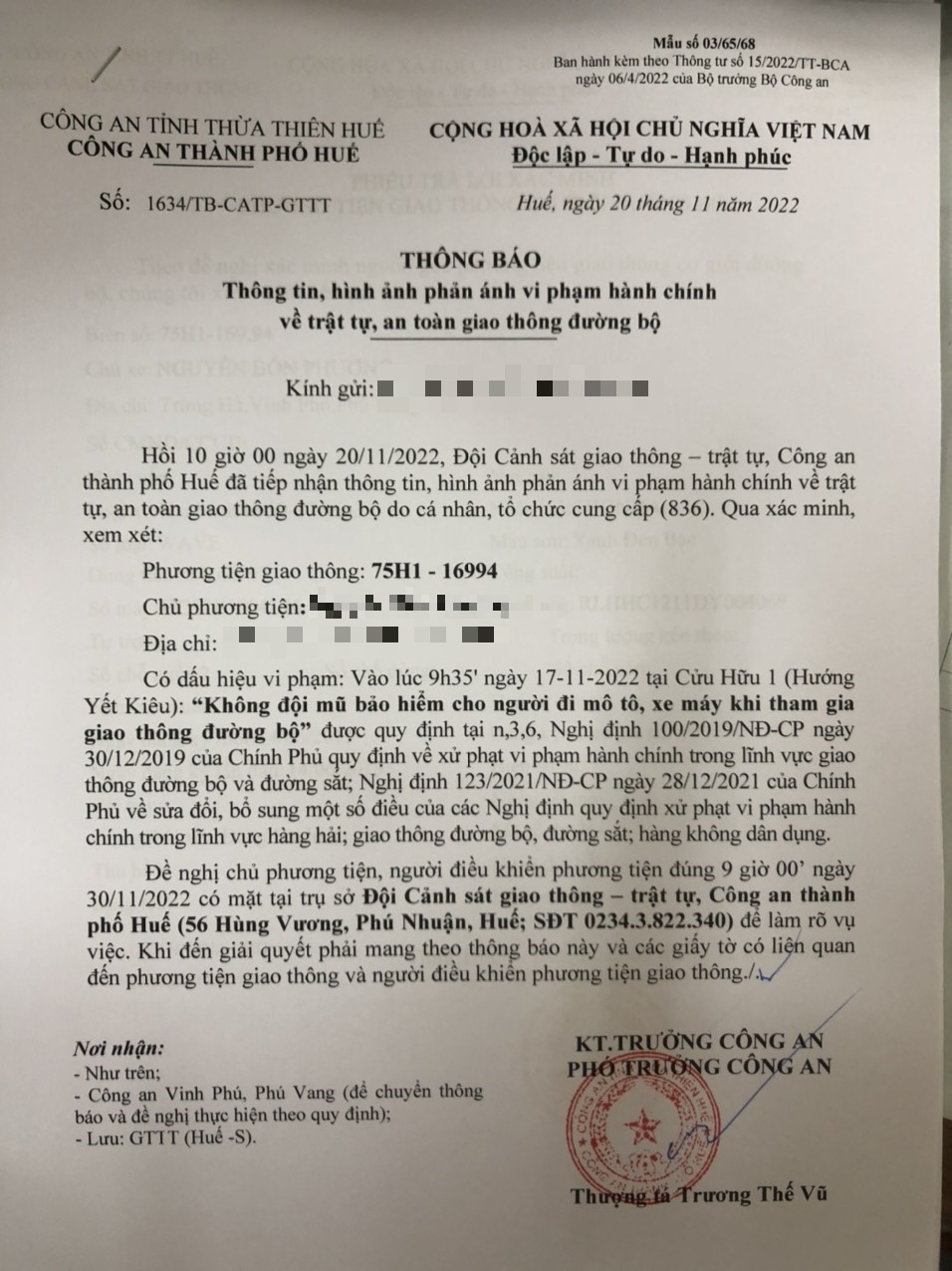 Vấn đề Ông/Bà phản ánh, Công an tỉnh đã chỉ đạo Công an thành phố Huế kiểm tra và xin thông báo kết quả xử lý như sau: