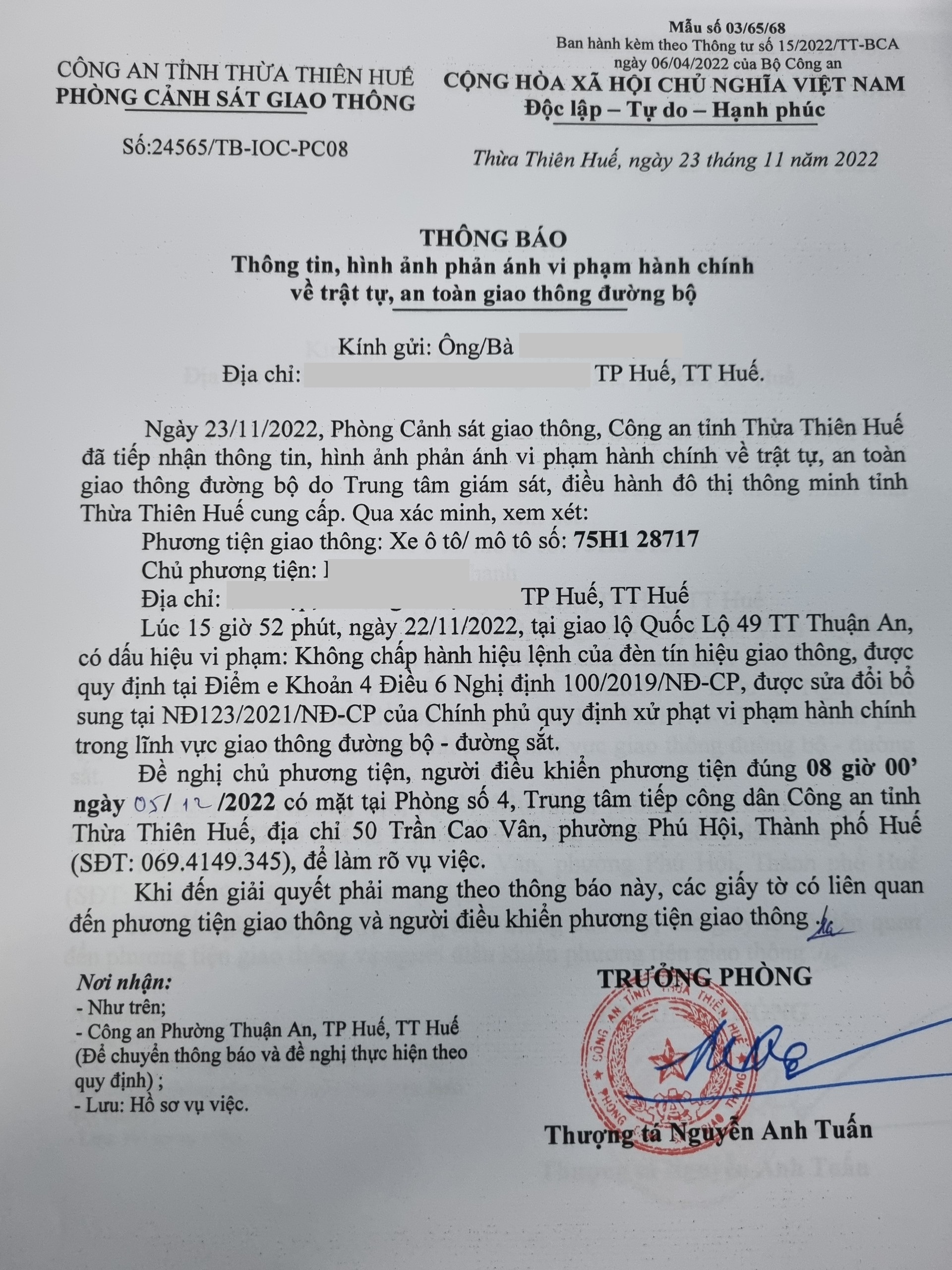 Vào lúc 15 giờ 52 phút, ngày 22/11/2022 xe máy mang biển kiểm soát 75H128717 vượt đèn đỏ/đèn vàng khi tham gia giao thông tại QL49 TT Thuận An 2