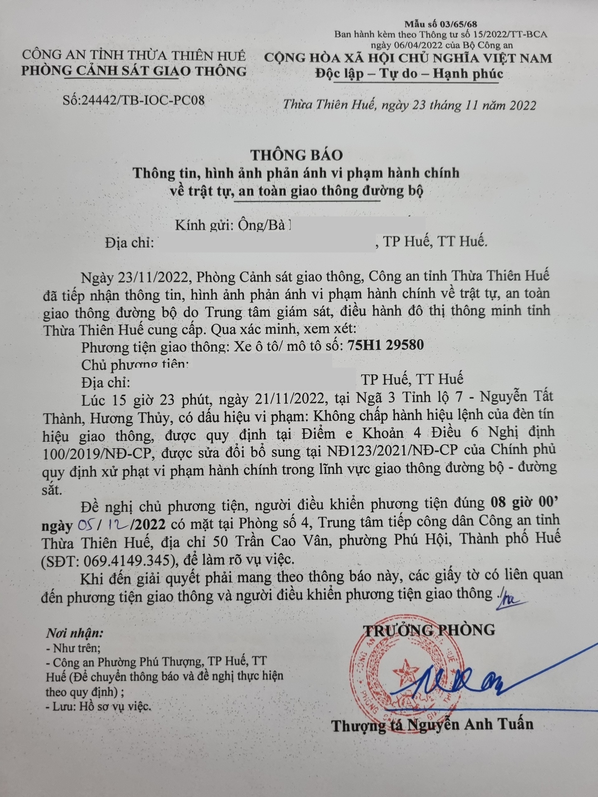 Phòng Cảnh sát giao thông xác định lỗi vi phạm của người điều khiển phương tiện 75H129580: Không chấp hành hiệu lệnh đèn tín hiệu giao thông, quy định tại điểm e, khoản 4, điều 6 Nghị định 100/2019/NĐ-CP được sửa đổi, bổ sung tại NĐ 123/2021/NĐ-CP.