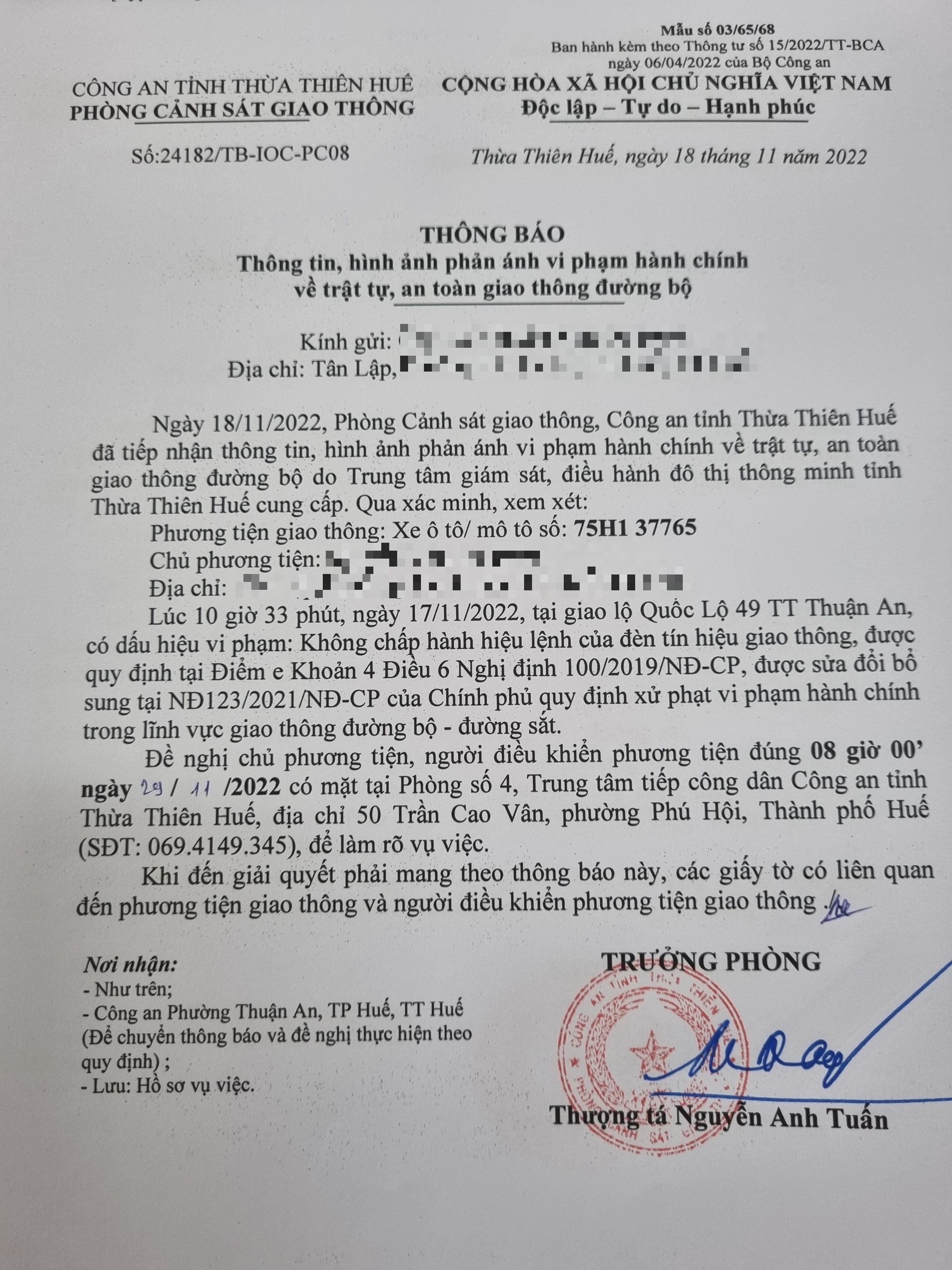 Phòng Cảnh sát giao thông xác định lỗi vi phạm của người điều khiển phương tiện 75H137765: Không chấp hành hiệu lệnh đèn tín hiệu giao thông, quy định tại điểm e, khoản 4, điều 6 Nghị định 100/2019/NĐ-CP được sửa đổi, bổ sung tại NĐ 123/2021/NĐ-CP.