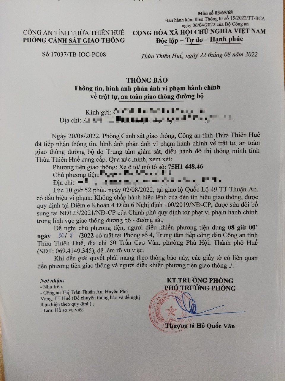 Vào lúc 10 giờ 52 phút, ngày 02/08/2022 Xe máy mang biển kiểm soát 75H144846 Không chấp hành hiệu lệnh của đèn tín hiệu giao thông tại địa điểm QL49 TT Thuận An